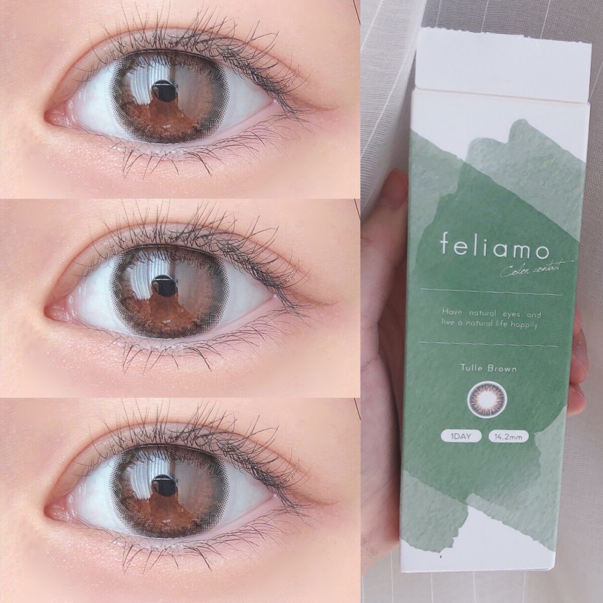 - ※2025年6月以降、商品パッケージ裏面・側面の一部表記を順次変更いたします。尚、これにかかる商品の交換・返品は承っておりません。 どんな瞬間にも溶け込む誰からも愛される瞳へ feliamoの由来は felice amore~幸せな愛~ 瞳から愛されオーラを放つ好印象レンズで女性らしさと品を演出。 オンも、オフも、特別な日も。 どんな場面にも溶け込むレンズラインナップで誰からも愛される瞳に。 UV CUT Feature1 肌や瞳に有害といわれ、白内障などの眼病を引き起こす危険性のある紫外線を99%カットします。(UV-A波75%、UV-B波99%カット) イオン性 Feature1 水分を多く含み酸素を通しやすいため瞳にやさしい使い心地で、快適な装用感です。 高含水 Feature1 水分が多く含むやわらかい素材で、快適なつけ心地です。 レンズ構造 Feature1 まぶた側に着色剤を内包しているため、角膜に色素が触れることがない構造を採用しています。 レンズ形状 Feature1 フチを丸みのある形状にすることで自然な装用感を実現しました。 ※装用感には個人差があります。 カラーコンタクトレンズの不適正使用による眼障害の危険性等などがあります。 ●コンタクトレンズは高度管理医療機器です。不十分な洗浄・消毒など不適切なケアや、長時間・交換期間を超えた装用により、アレルギー性結膜炎、角膜感染症、角膜潰瘍等の重篤な眼障害が発生する危険性があります ●ご使用前に取扱説明書を確認してください 使用上の留意事項 ●眼科医院等を受診してからお求めください ●眼に異常を感じたら直ちにレンズ使用を中止し、お近くの眼科等で診察を受けてください ●医師の指示にしたがってご使用ください ●コンタクトレンズを装用する場合、自覚症状がなくても、眼科医院等での定期検査を受けてください ●レンズに不具合がある場合は使用しないでください