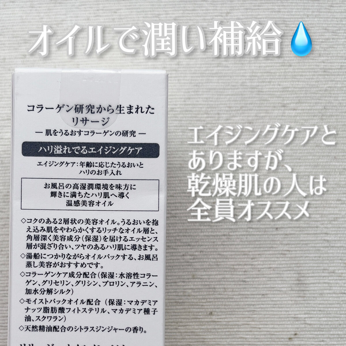- 「リサージ オイルインパクト」は、お風呂の高湿潤環境を味方に、輝きに満ちたハリ肌に 導く二層になったオイル状美容液です。入浴時は肌がやわらかくなりお手入れしやすい状態に なることに着目、バスタイムを絶好のスキンケア時間と捉えて開発しました。お風呂で洗顔し た後に使います。使う前にボトルを振ることで、うるおいを抱え込み肌をやわらかくするリッ チなオイル層と、角層深くに美容成分(保湿)を届けるエッセンス層が混ざり合い、 使うたびに輝きに満ちたハリ肌へと導きます。リサージ独自開発のコラーゲンケア成分※4(保湿)や、モイストパックオイル※5(保湿)を配合。天然精油配合のシ トラスジンジャーの香りが、手に取った瞬間から浴室全体にふわっと広がり、心地 よい気分で湯舟につかりながらキレイを磨くことができます。 ※4 水溶性コラーゲン、グリセリン、グリシン、プロリン、アラニン、加水分解シルク ※5 マカデミアナッツ脂肪酸フィトステリル、マカデミア種子油、スクワラン