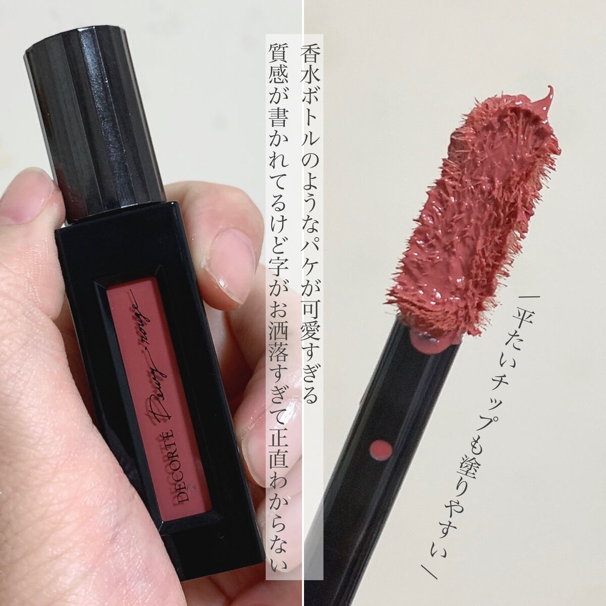 - 無意識に、美しさつづく。 軽やかで心地いい、 艶とマットのスキンケアルージュ。 独自のテクノロジーで“肌を美しく魅せる”ことにこだわり、 自らをエンパワーするような豊富なカラー展開の 「ルージュ デコルテ」から、 唇に纏うあいだ、ずっと軽やかなうるおいに満たされ続けるような心地よさの 「ルージュ デコルテ リキッド」が誕生します。 コスメデコルテならではの、 うるおいと彩りを長時間持続させる 「ハイパフォーマンスカプセル処方」を採用し、 高いラスティング効果を実現。 唇への心地よさと塗りやすさにこだわった平型形状のチップで、 ひと塗りで美しく均一な塗布膜を叶えます。 Dewy rouge (デューイ ルージュ ) 素の唇と一体化するような、生きた艶。 みずみずしく軽やかなタッチで濃密な発色を叶え、 美しい仕上がりと心地よさが続くリキッドルージュ。 01 signature red / 06 urban wear / 07 warm maple / 08 bitter lips / 09 for luck / 10 vivid memory / 11 departure time / 12 star spice /13 spring coral /14 skin rose Foggy rouge(フォギー ルージュ) 50秒で、二次付着レス。 加湿されているような心地よさで唇を彩り、 つけたてのマットな高発色が持続する、 トランスファープルーフのリキッドルージュ。 05 signature red / 15 be stylish / 16 cassis dolce /17 mannish lady / 18 dried flower