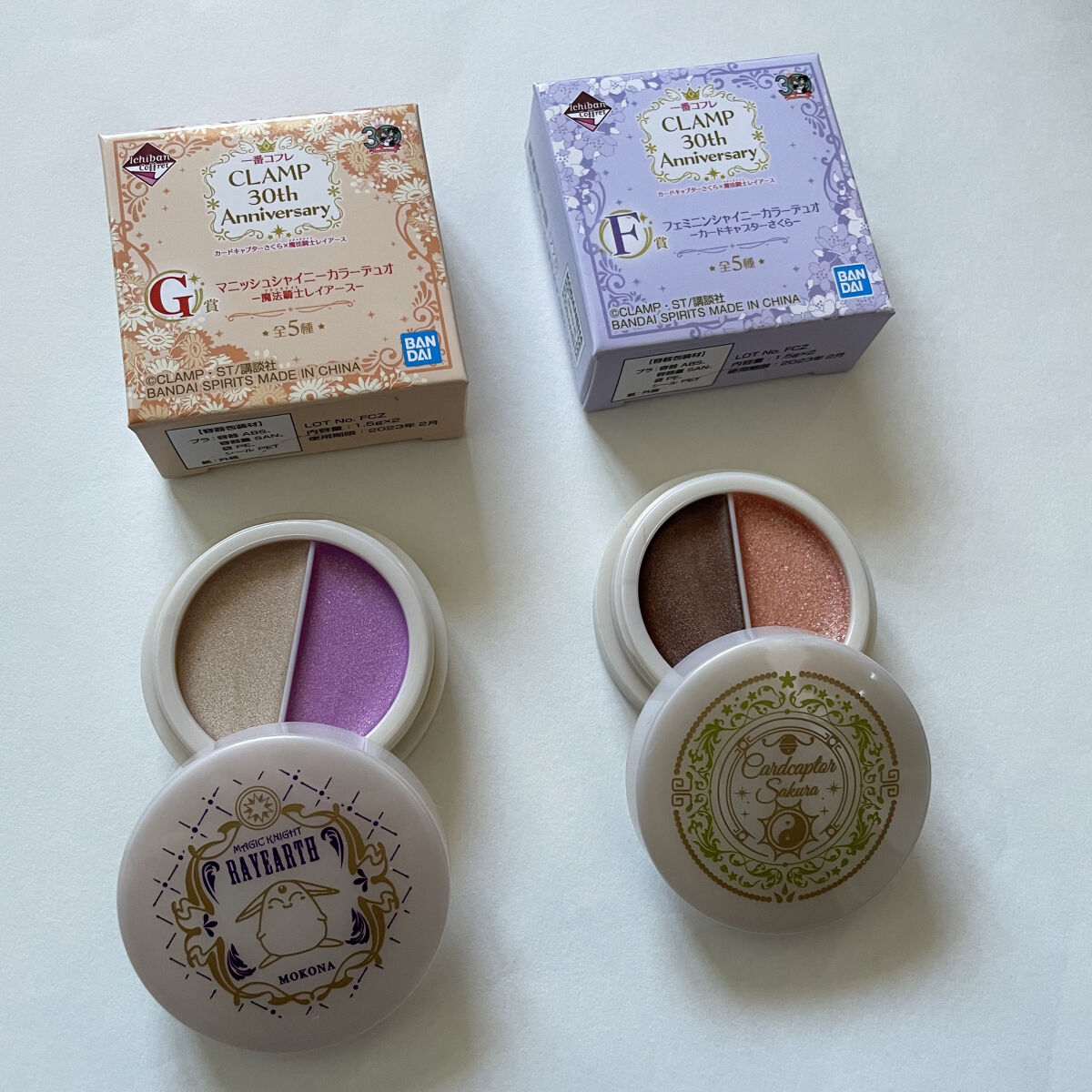 魔法騎士レイアースとカードキャプターさくらの1番コフレ6回挑戦。本当はレイアースもっと欲しかったけど、レイアースは色的に使いにくそうだったので結果的に満足🥰フェイスカラー右のモコナと下のケロちゃんはラメ感出るだけの薄付き。左の封印の鍵は色わか...