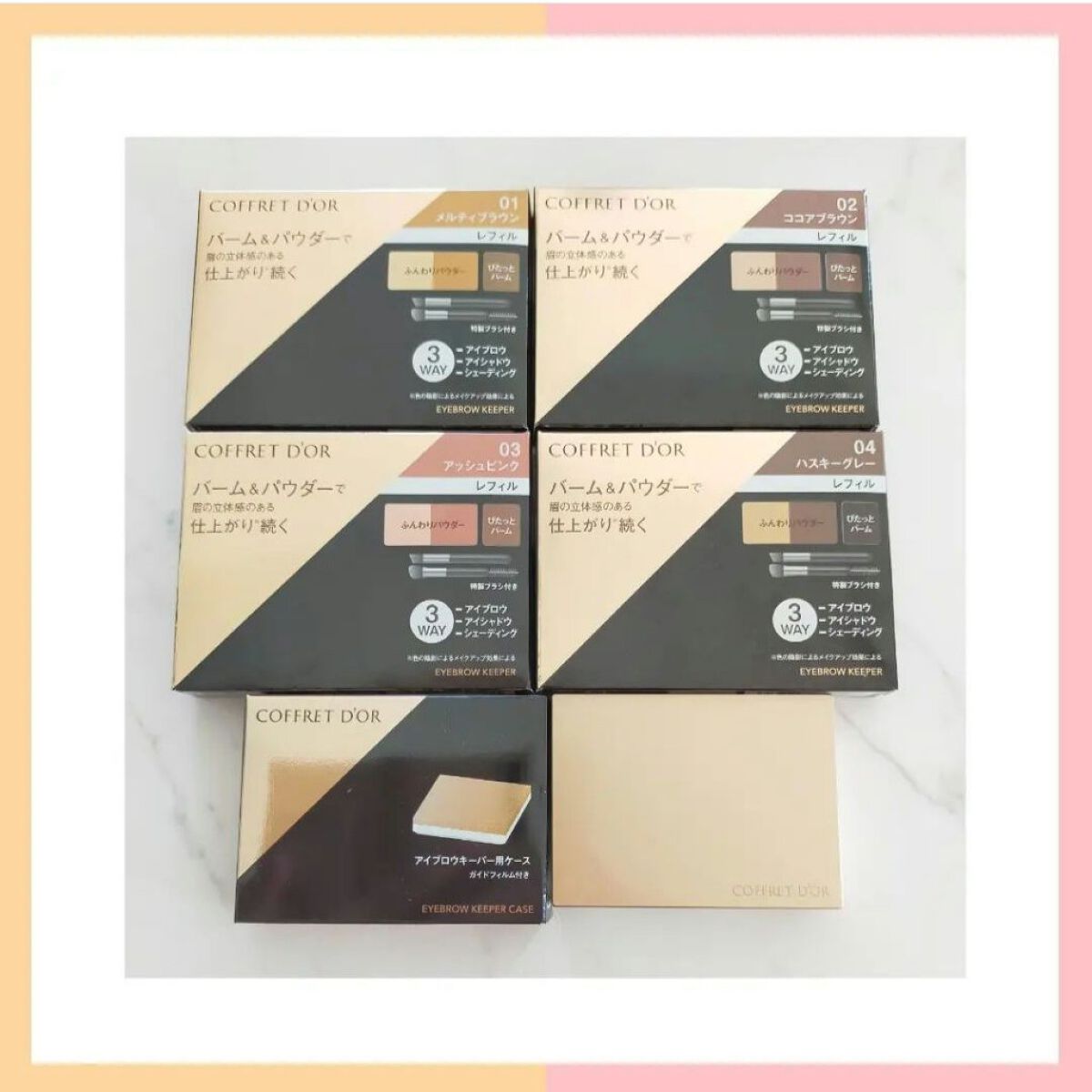 - ぴたっとバームとふんわりパウダーで眉の毛流れ、立体感のある仕上がり※、続くシェーディングやアイシャドウにも使えるアイブロウパレット ※色の陰影によるメイクアップ効果による ぴたっと密着バーム&ふんわり定着パウダーの合わせ使いで、汗・マスク着用時の蒸気にも対応し、毛が生えていない部分も消えにくい、ウォータープルーフタイプ。 ● バームとパウダーの質感の使い分けで、より精密な毛流れや影を表現。 ● シェーディングやアイシャドウまで、顔中使えるマルチタイプ。 ● 使い心地にもこだわった特製ブラシ付き。 コフレドール アイブロウキーパー 全4 種 3.0g こちらの商品は詰め替え用〈レフィル〉です。別売りのアイブロウキーパー用ケースにセットしてお使いください。 アイブロウキーパー用ケース1種(税込770円 ※編集部調べ) 01メルティブラウン(ライトブラウン系) 02ココアブラウン(ブラウン系) 03アッシュピンク(ピンク系) 04ハスキーグレー(グレー系) <数量限定:初回限定版> シェーディングやアイシャドウにも使えるマルチタイプで、絶妙なニュアンスカラーを揃えたウォータープルーフタイプのアイブロウパレットのレフィルにケースがついた便利なセット。 セット内容 コフレドール アイブロウキーパー3.0ℊ(現品) コフレドール アイブロウキーパー用ケース(現品)