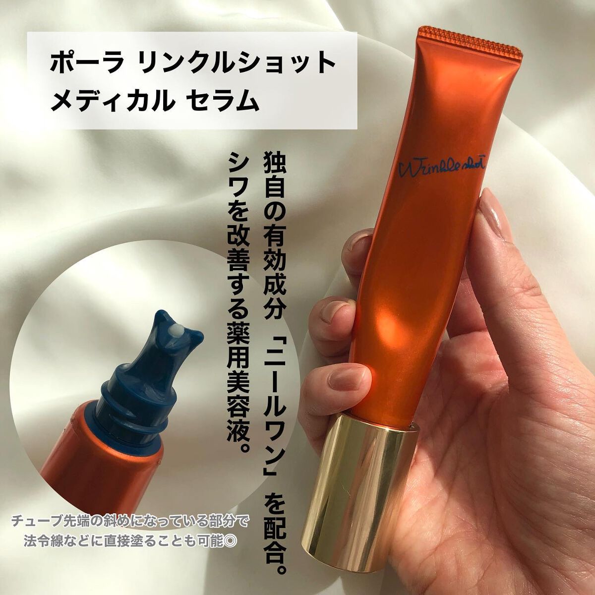 発売前から話題沸騰のポーラ リンクルショットの新美容液! あのメディカルセラムが全顔に使えるなんて! 「ニールワン」は、シワを改善する有効成分として承認された、ポーラ独自開発の有効成分。 シワ改善には毎日コツコツとした日々の積み重ねが重要! みずみずしくすーっと肌馴染みの良いテクスチャー。 その後のスキンケアも続けやすく、朝のメイク前にもぴったりな使い心地。