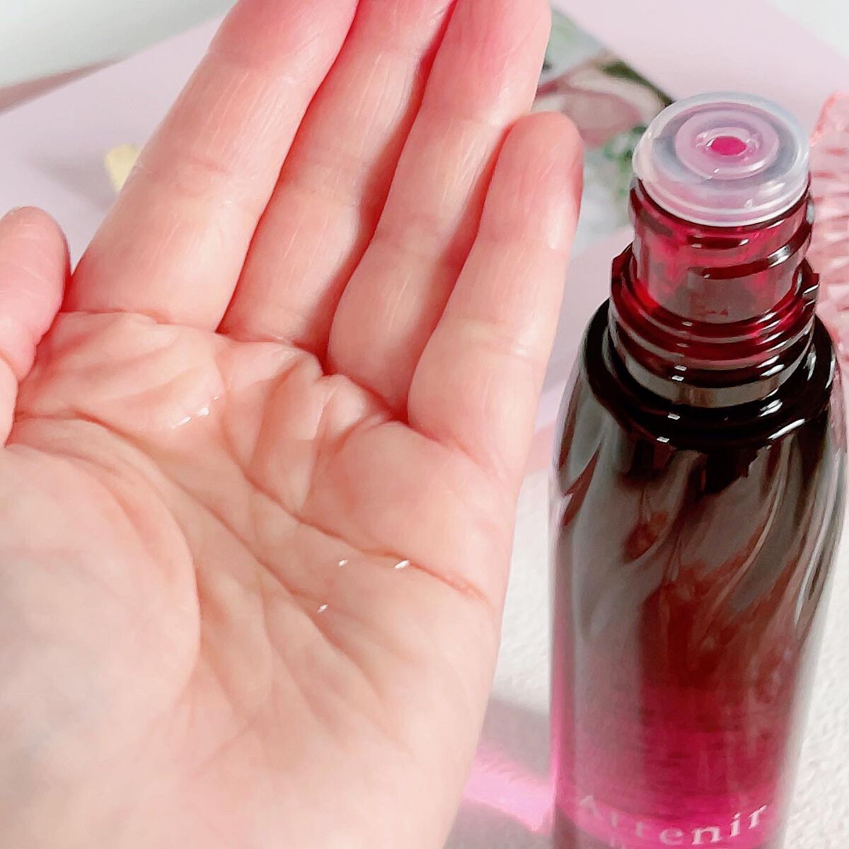 肌に潤いを与え、シミ・そばかすを防いでくもりのない肌へ導く美容液 いちごシロップみたいな見た目が好き、ビタミン12由来の色なんだそう とろみがあるけどメイク前にも使えるのがいいなと思うベタつきにくいテクスチャー