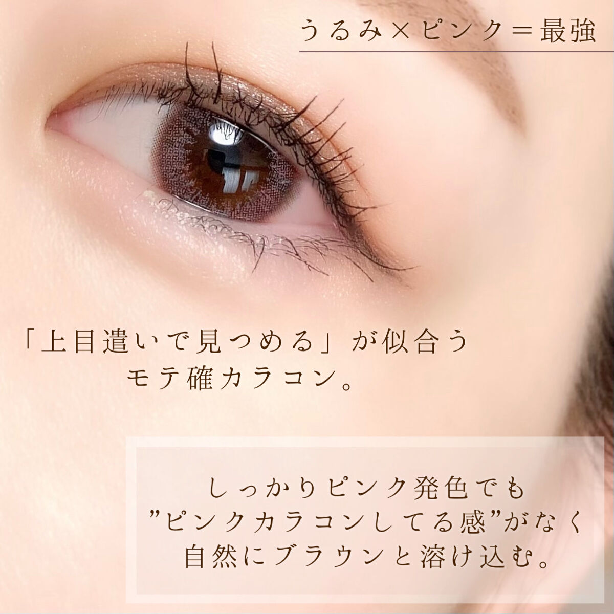 ほんのり甘いピンクブラウンで、ぷるぷるちゅるちゅると透明感のある瞳になれるカラコン🫶🏻💘 自然にトーンアップを叶えてくれる甘くやわらかなピンクカラーで、可愛さ溢れる印象になれちゃいます🐰🫧 着色直径は13.6mmと程よいサイズ感◎ 大きすぎず小さすぎないので、こっそり盛れるのも嬉しい〜🥹💖