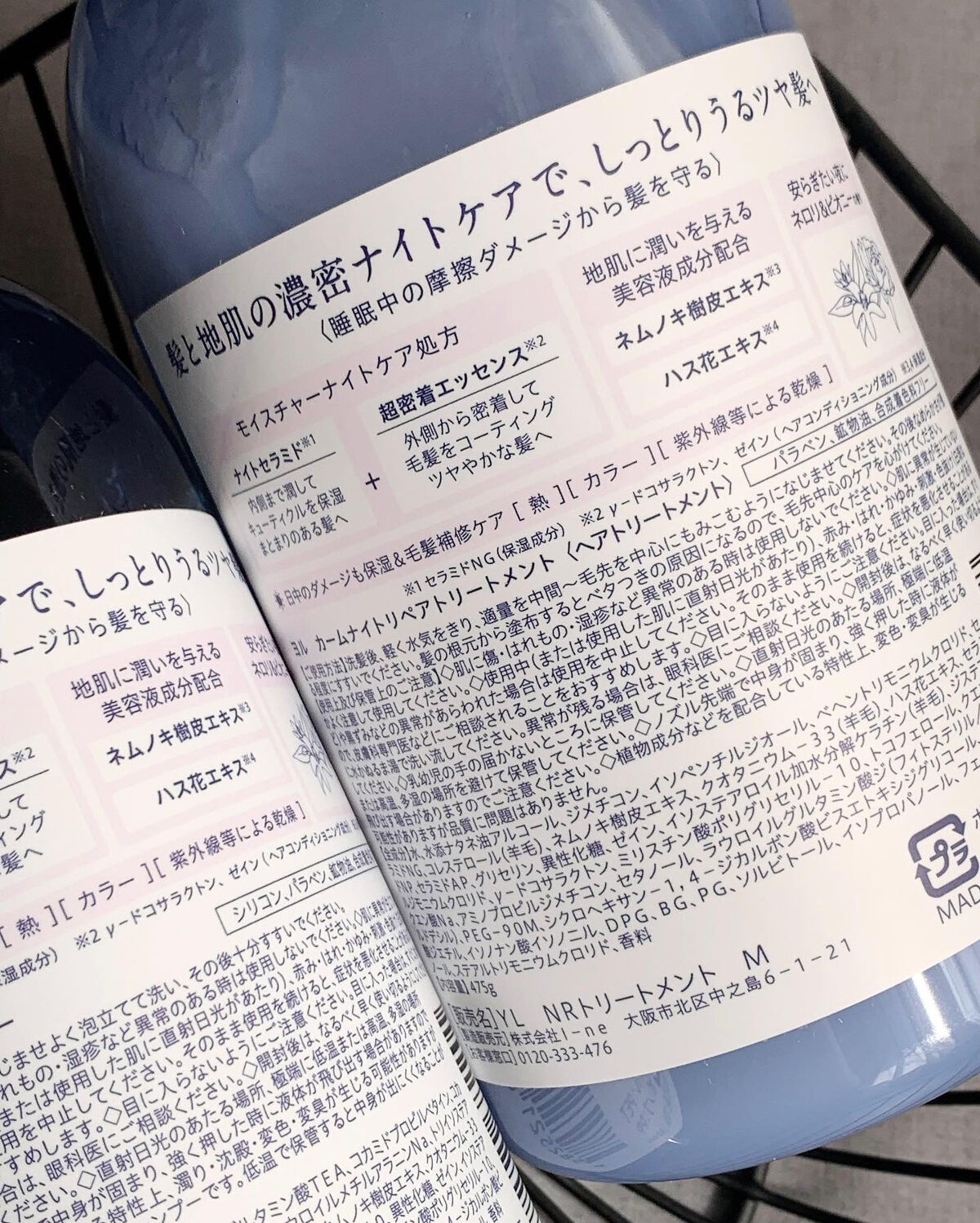 - ダメージリスクは日中だけでなく、夜にも。髪と地肌の濃密ナイトケアで、しっとりうるツヤ髪へ。 ナイトキャップ処方で睡眠中の摩擦・乾燥ダメージから髪を守り、地肌に潤いを与える美容液成分配合。 シャンプー:シリコン、パラベン、鉱物油、合成着色料フリー トリートメント:パラベン、鉱物油、合成着色料フリー ◎ネロリ&ピオニーの香り