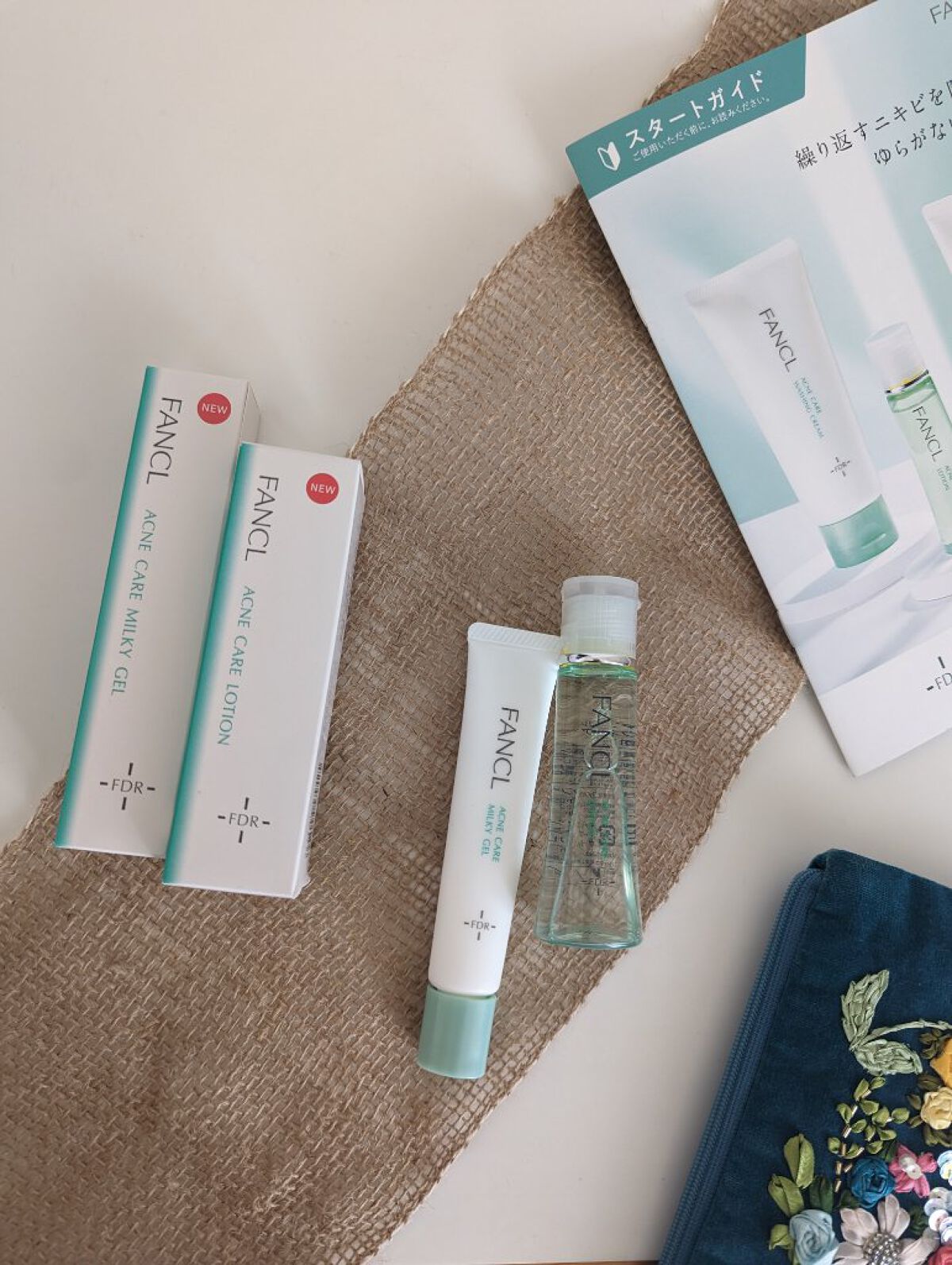 繰り返す大人ニキビの悩みに向き合ったファンケルのアクネケアライン✨ ニキビとバリア機能の関係に着目しておりうるおいを保ちながら、毛穴詰まり・角栓をケアしてくれます✨ ボトルも無添加のため1ヵ月分使いきりサイズで製造年月日が印字されてました! 顎周りに大人ニキビ繰り返しできるのでこちらでケアしていきます〜🥹