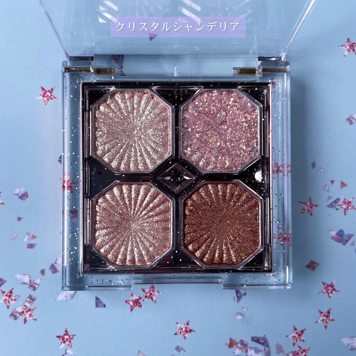 - 4色のアイシャドウを重ねるだけで理想のグラデーションが手軽に完成。深みを与えるマットや上品な艶めきをプラスするシマー、華やかなラメを組み合わせれば、こなれ感とナチュラルさを持ち合わせた目元に。シャンデリアのように華やかなグリッターやラメをのせて、毎日のメイクをもっとスペシャルに!