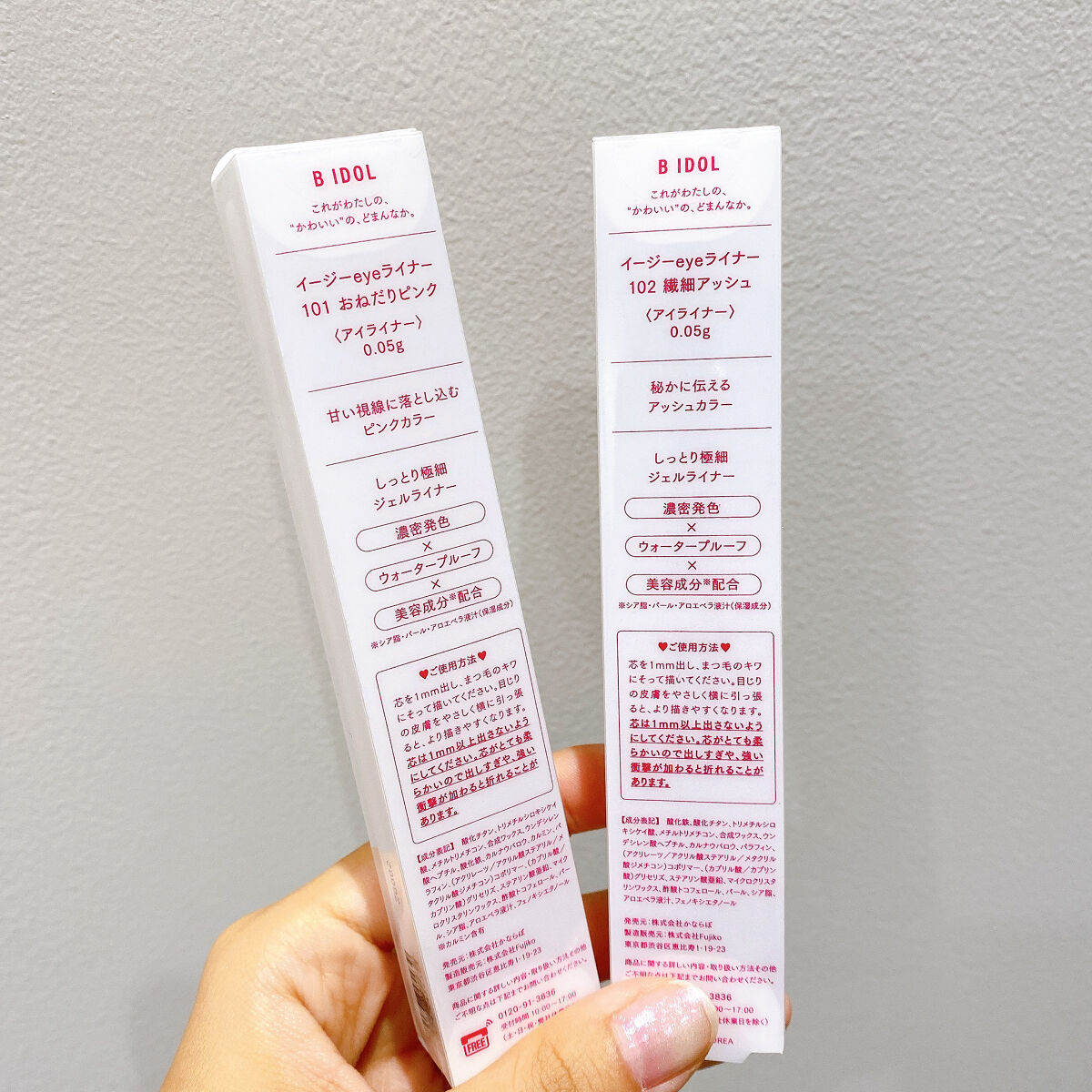 - 目元で伝える、わたしのサイン。 濃密発色×ウォータープルーフ×美容成分*配合のしっとり極細ジェルライナー。 アイラインは細く、ナチュラルなデカ目に見せたい! 吉田朱里がこだわり抜いた、ワンタッチでくっきり描けるジェルライナー。 濃密発色でピタッとフィットして滲みにくい。繊細なメイクも大胆なまなざしも誰でも簡単に叶います。 <高発色&高密着> 揮発性オイルが含まれているため、素早く密着し、鮮明なラインを演出。 <柔らかい質感&スリムなペン先> ペンシルが柔らかく、瞼に負担感少なく描けるのが特徴。 スリムな斜線とフラットタイプのペン先で、跳ね上げも簡単。 *シア脂・パール・アロェベラ液汁(保湿成分) ATTENTION 芯は1mm程度出してお使いください。芯がとても柔らかいので、出しすぎや強い衝撃にご注意ください。 落下や芯の出しすぎ、強い力を加えてのご使用は芯折れの原因となりますのでご注意ください。