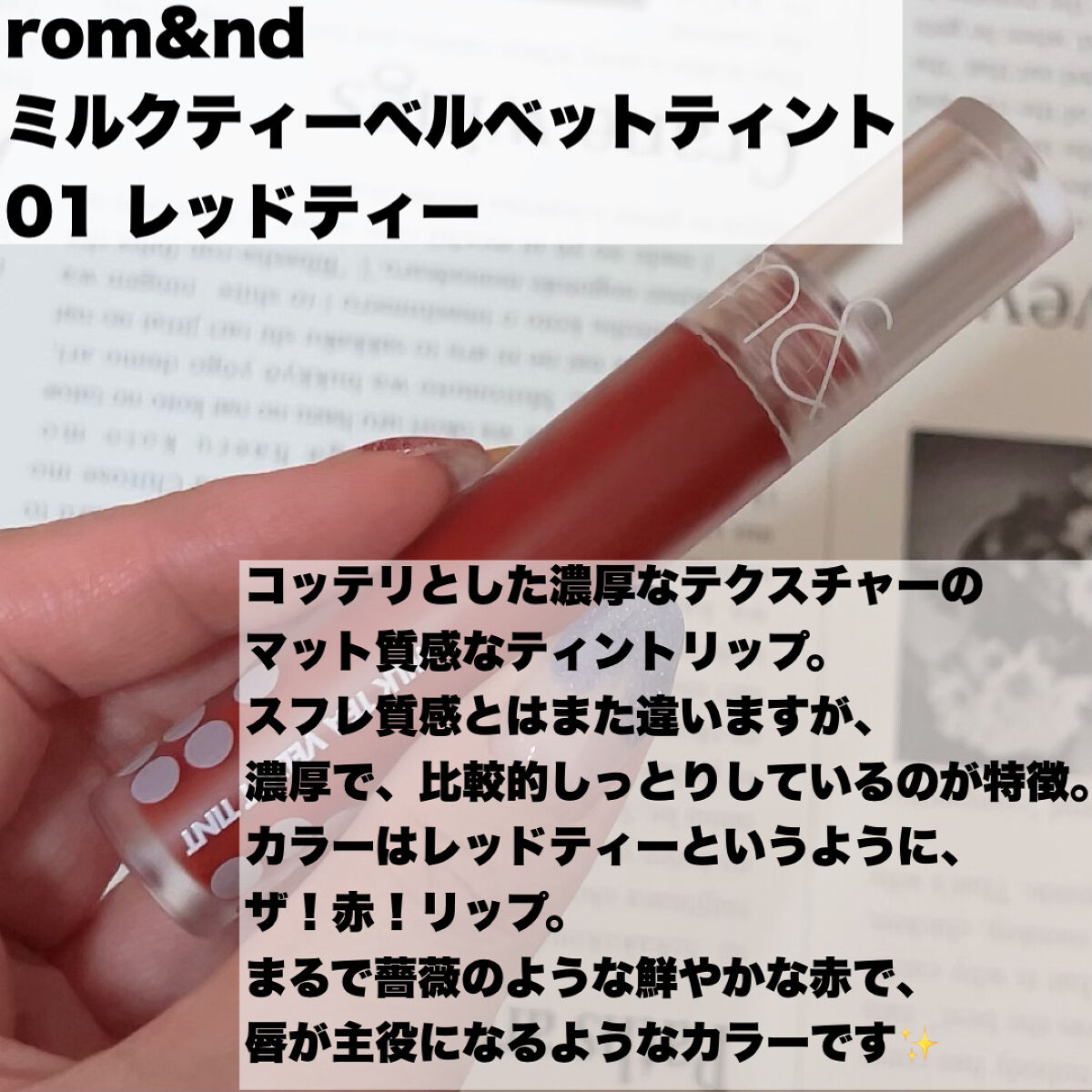 【まるで薔薇のような鮮やかな赤リップ】 rom&ndのミルクティーベルベットティント、01レッドティーが薔薇のようで可愛い💕 ✂ーーーーーーーーーーーーーーーーーーーー ⭐️rom&nd ミルクティーベルベットティント 01 レッドティー しっとり感のあるマット質感リップ✨ マットの割には縦皺が目立つ感じはあまりない気がします。 しっとりとしたパサつき感のないテクスチャも相まってまるで薔薇のような赤リップ✨ 鮮やかなパサつき感のない赤リップをお探しの方にオススメです⭐️
