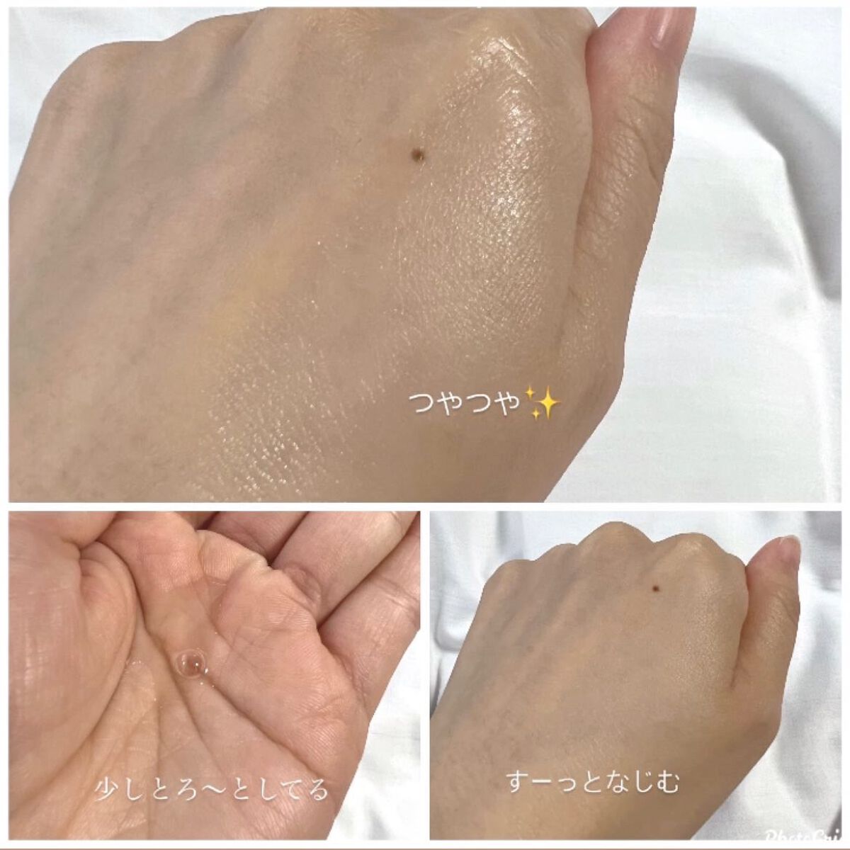 2種類の美容液が同時に出るので手の甲で軽く混ぜて使うと 本当にスーッピタッとお肌に密着して馴染んでくれます。 ベタつくこともなくピールケアも同時にしてくれるのでつけた瞬間から滑らかなつるんと肌に なります 保湿力も高く翌朝までお肌がしっとりしています つけると薄膜でお肌にハリ感が出てキメが整っていきます 高級感のある香りでスキンケアしながらリラックスできます