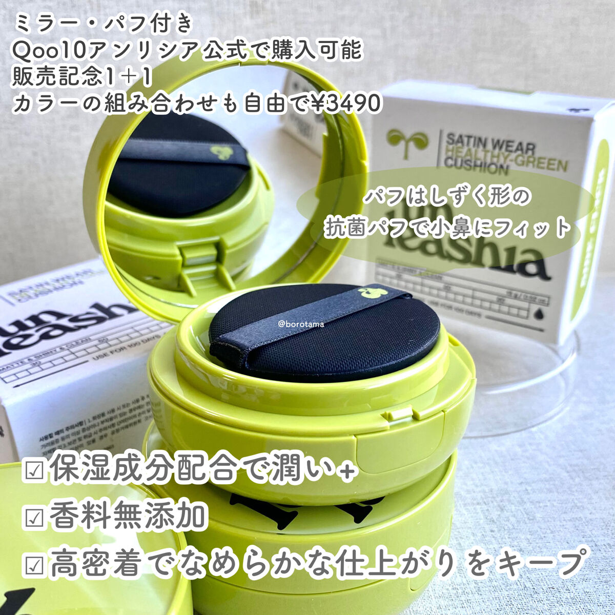 内側から滲み出るような光彩を演出してくれるツヤタイプのクッション♡しかも、つけたての綺麗なツヤを長時間キープしてくれる🥺 ほんのりとしたツヤ感はキープしつつ、バクチオール配合で健康的な肌表現をしてくれるサテンクッション✨️しっかりとしたカバー力もありつつ、薄膜を纏ったような軽さのある使用感もgoodでした🥺 ピンクは18色、グリーンは21色と豊富な色展開も凄い!!😳