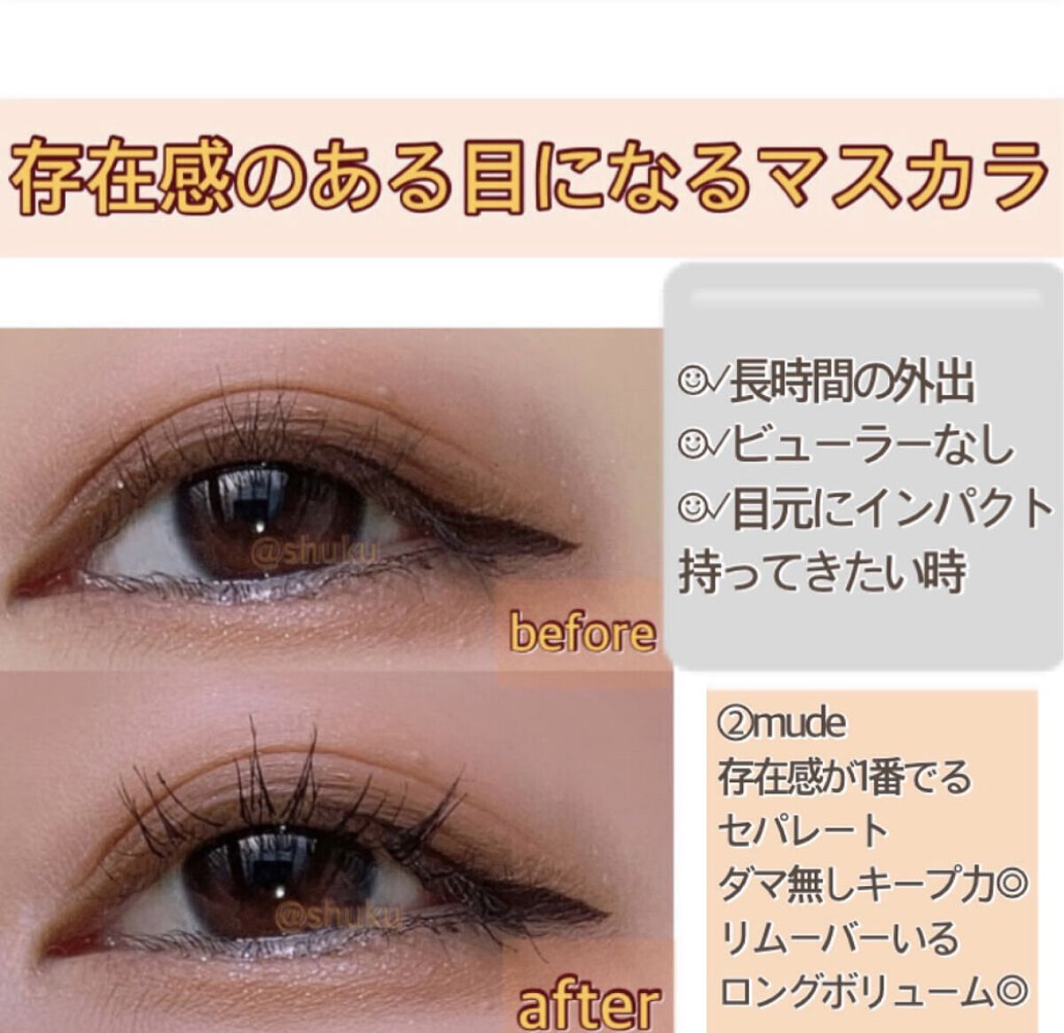 \mude.マスカラ3種/mude.インスパイアカーリングマスカラロングラッシュ/ボリューム/スキニーロングラッシュまつエクしたかのようなロング感。わたしの推し🫶🏻ボリュームふさふさボリュームまつげに。スキニー繊細な仕上り。下まつげに推し!...