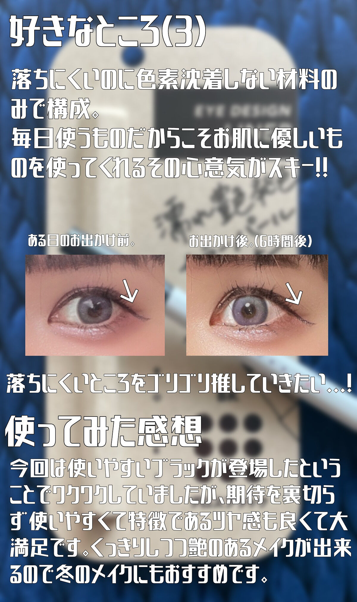 - 〇パールなのに落ちにくい!高密着なので水、汗、涙、こすれに強い。 きれいな仕上がりを持続。 〇発色に合わせた筆先を開発。 柔軟性とコシを兼ね備え、どんなラインでもブレずに描けます。 〇速乾性でよれやにじみによるくずれを防止。 〇染料不使用。 〇優れた耐水性なのにお湯+洗顔料でオフ。 (まれにアイシャドウ等と混ざると落ちにくい場合があります。その際はお使いのクレンジング料で落としてください)