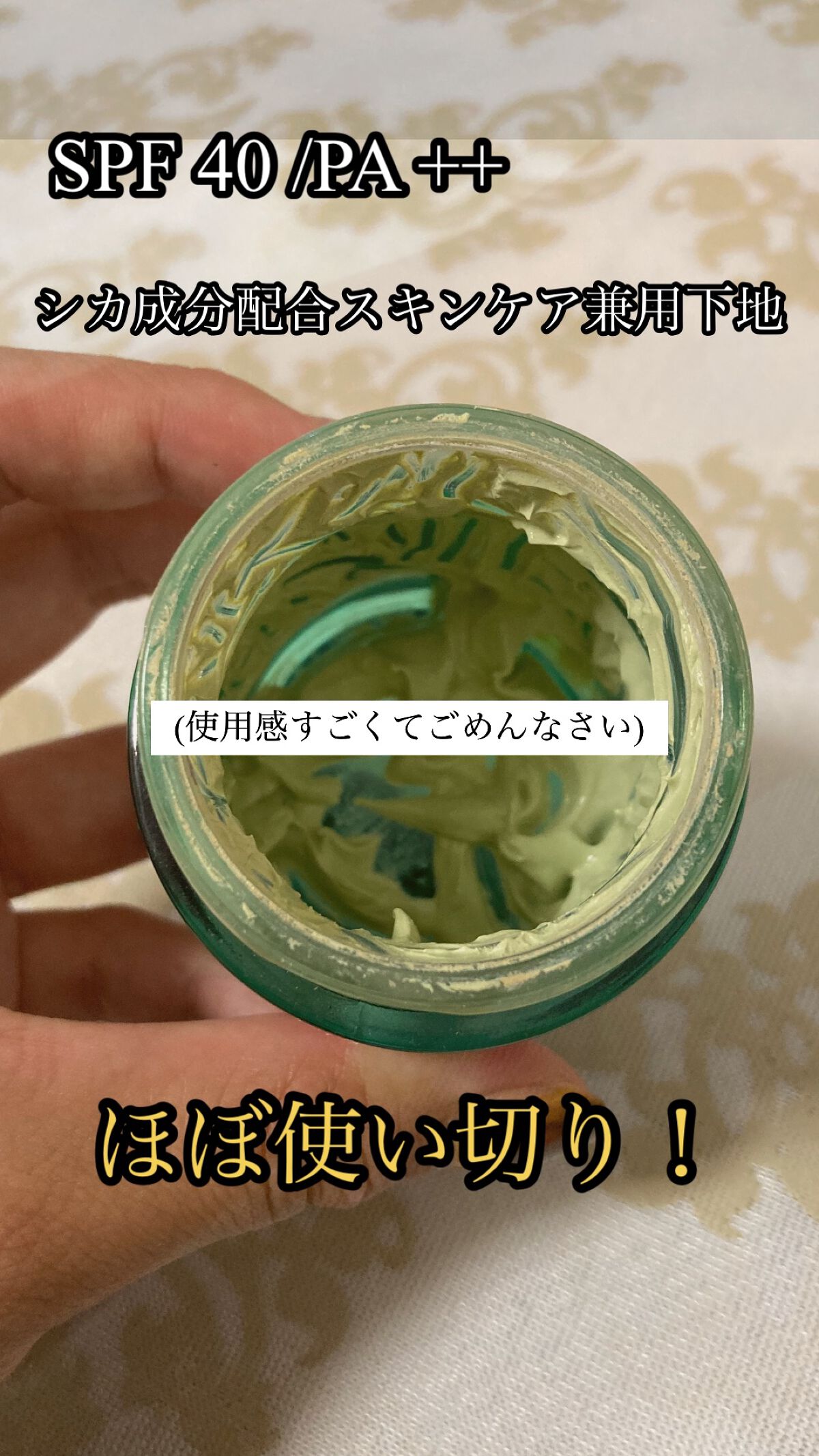 - 赤みをきちんとカバーするスキンケア兼用下地。緑色のクリームが肌でベージュ色に変化し、ニキビ跡やくすみをカバーします。