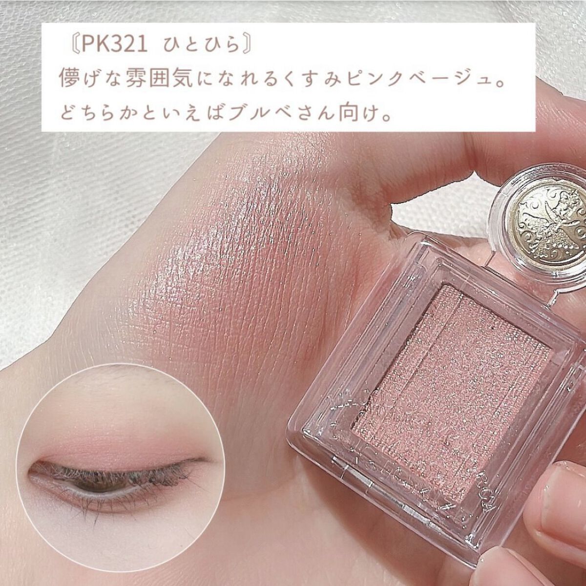ひと塗りでまばゆく発色 思いのままにカスタムできるフォルム整形アイシャドウ。 PK321 ひとひらはブルーパールが輝く赤みピンク🩷 単色で仕上げるのはもちろん、コルクとの組み合わせがお気に入り☺︎ プチプラの単色シャドウでマジョマジョが最強やと思う✨️