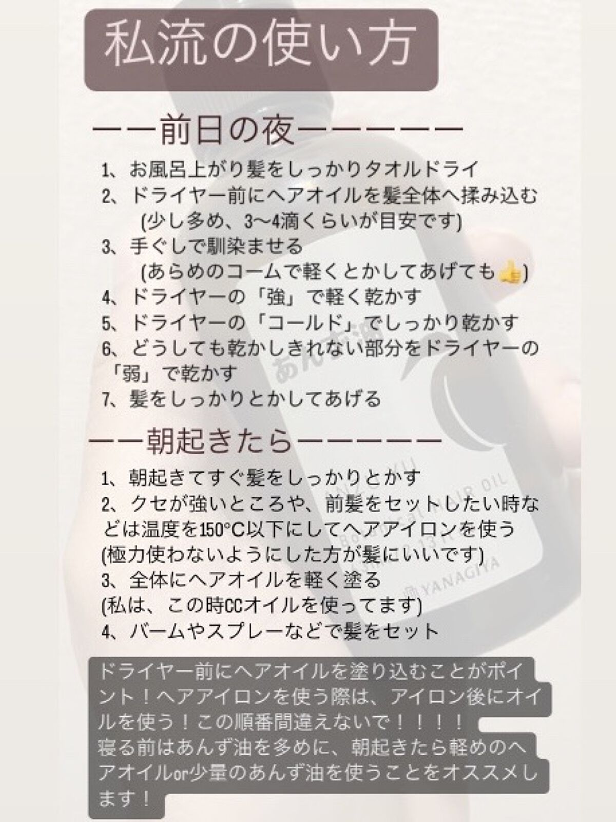 ・しっとりまとまる・絡まらない・サラサラ・ツヤが出る・柔らかい髪質になる・アイロンいらず・重めのテクスチャー・ほんのりあんずの香り・いっぱい入ってる ちなみに私は、このオイルでくせ毛とおさらばしました👋朝起きれば髪爆発、絡まりすぎてくしが通らない、アイロン無しで外出不可能…そんな人生を歩んできた私にとって、このオイルは神。最近ではアイロンなしで外出できるんです!これってすごくないですか…! ・つけ過ぎるとベタベタ・髪の毛ボリュームダウン・ビンなので持ち運びにくい・適量のオイルを出しにくい(ボトルぶんぶん振らないとオイルが出てきません) 髪がゴワゴワするなぁ…😮💨髪が広がってセットが大変…🥵そんな悩みを持っている人は絶対買った方がいい!!私が心からおすすめするオイル、ぜひ使ってみてください