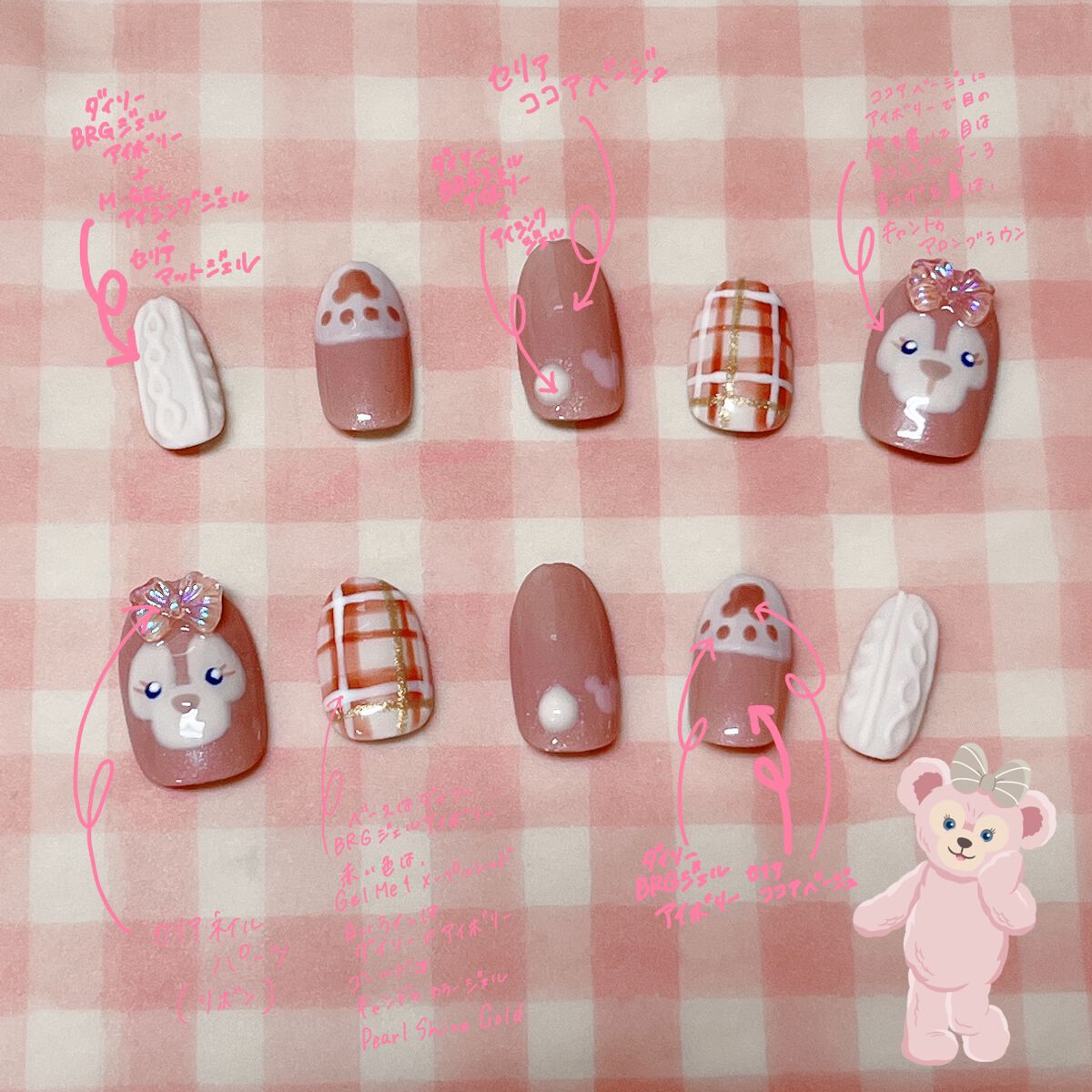 ニット柄とチェック柄なのでこれからの時期にピッタリですよね🧶 シェリーメイ全体を描こうとすると難しいので簡単に😊 リボンはセリアのネイルパーツを使用しました💓凝ってるように見えて結構簡単にできるところが意外と嬉しい💓 これからのディズニーにピッタリなネイルができてよかったです✨ DAISOとセリアのネイルはほんと便利ですね☺️