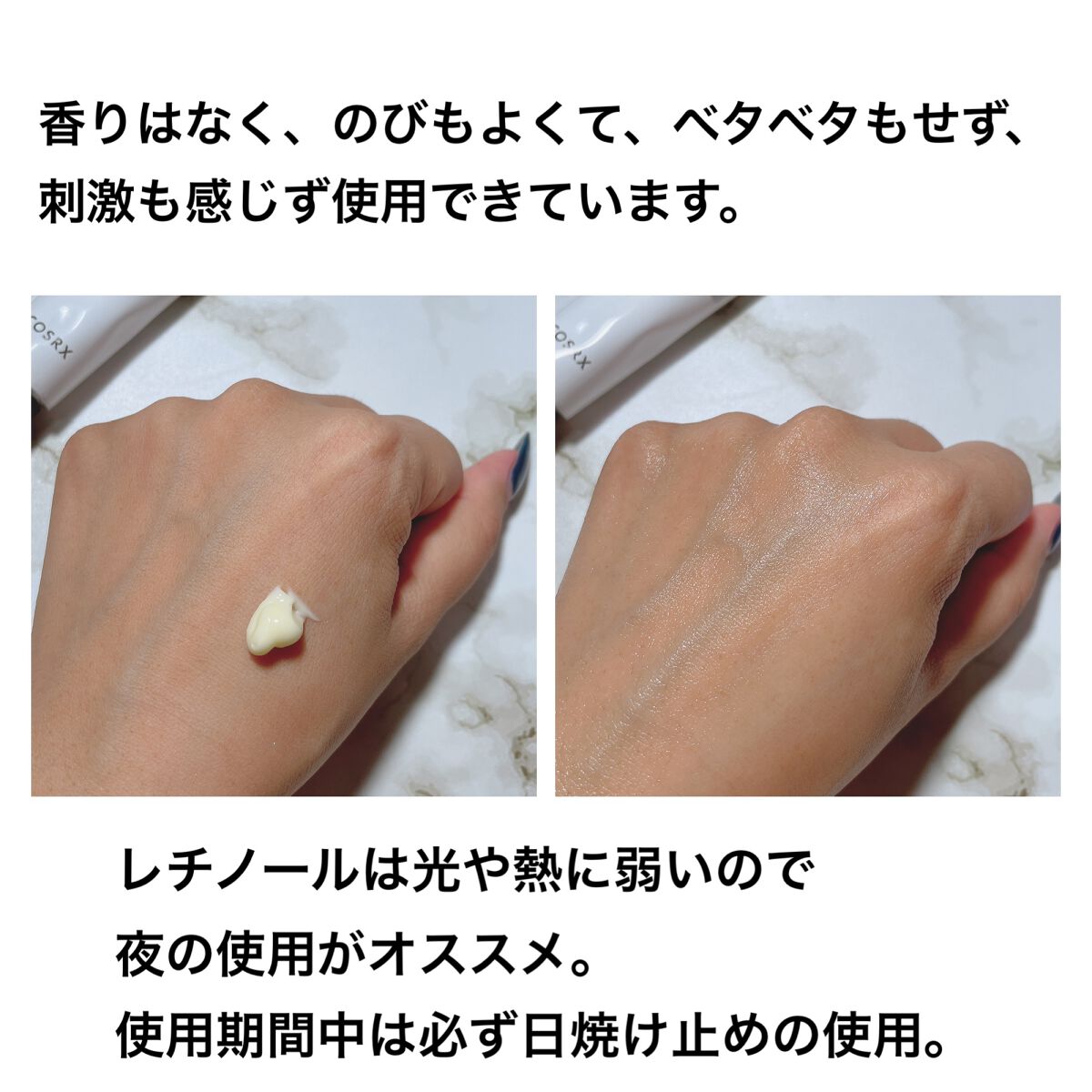 レチノール初心者でも安心して使用できる0.1%安定化処方で、低刺激でデイリーに使える。 開き毛穴は小さくなってるし、ハリが出てお肌がふっくらキメ細やかになってきたと思う😭👏🏻 レチノールは日光が刺激になるため、朝のスキンケアには使えないよ🙅🏻♀️