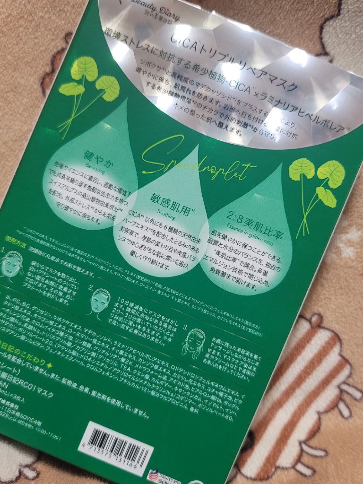 - 我的美麗日記からCICAマスク登場!! 環境ストレスに対抗する植物- CICA*1×ラミナリアヒペルボレア*2 ツボクサ*1と高純度のマデカッソシド*1をプラスし、肌荒れを防ぎます。 希少植物褐藻*2のチカラで乾燥等の外的刺激から守り、キメの整った肌へ整えます。 健やか Balancing 過酷な環境下で成長を繰り返す、スイスアルプスの高山植物由来成分*3を配合。外部ストレスからお肌を守り健やかに保ちます。 敏感肌用*4 Soothing 6 種類の天然由来ハーブエキス*5を配合した美容液で、ゆるぎがちな肌に潤いを届け、優しく守り続けます。 2:8美肌比率 Essence in golden ratio 脂質と水分のバランスを、独自の""美肌比率""で調合し、肌を健やかに保ちます。多重エマルジョン技術で閉じ込め、角質層まで届けます。 ◆我的美麗日記のこだわり◆ パラベン、アルコールを配合していません。また、鉱物油、色素、蛍光剤を使用していません。 *1ツボクサエキス、マデカッソシド(全て整肌成分)*2ラミナリアヒペルボレアエキス(整肌成分)*3ロドデンドロンフェルギネウムエキス(整肌成分)*4すべての方に皮膚刺激がないわけではありません*5イタドリ根エキス、オウゴン根エキス、ローズマリー葉エキス、チャ葉エキス、カンゾウ根エキス、カミツレ花エキス(全て整肌成分) 使い方 事前に洗顔後に化粧水でお肌を整えます。 1、袋からマスクを取り出しお顔全体に広げる。白いプラシートははがす。 2、10分経過後にマスクをはがす。時間に余裕がある場合は20~30分置いていただくとよりお肌に潤いを与えます。 3、お顔に美容液が残っている時は、指先で軽くマッサージしながらなじませる。※水で洗い流す必要はありません。マスクケア後は乳液やクリームなどで普段のお手入れを行ってください。