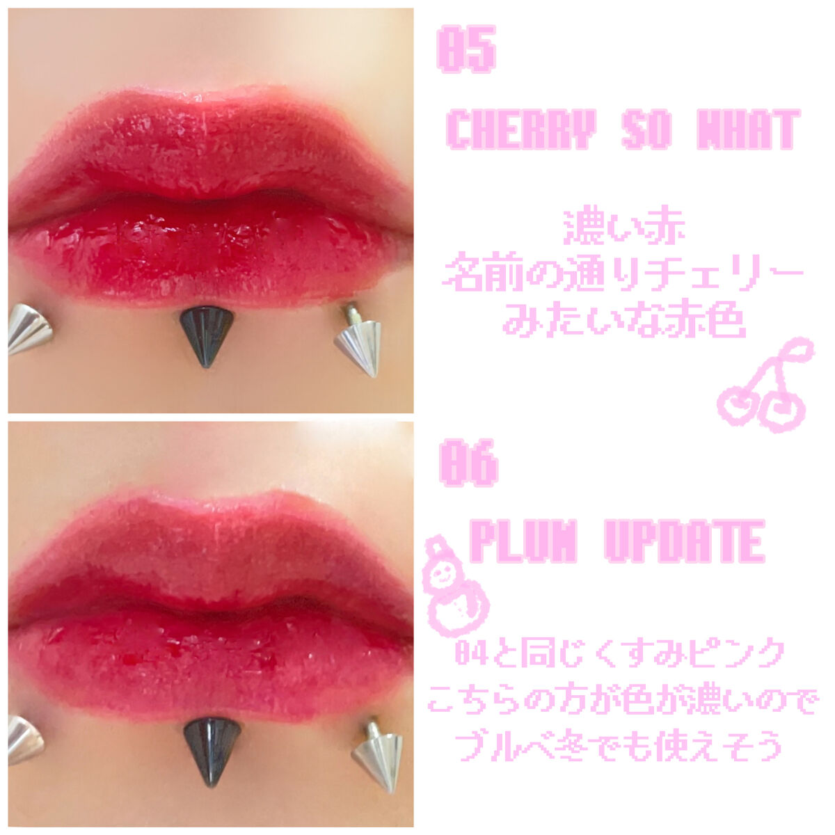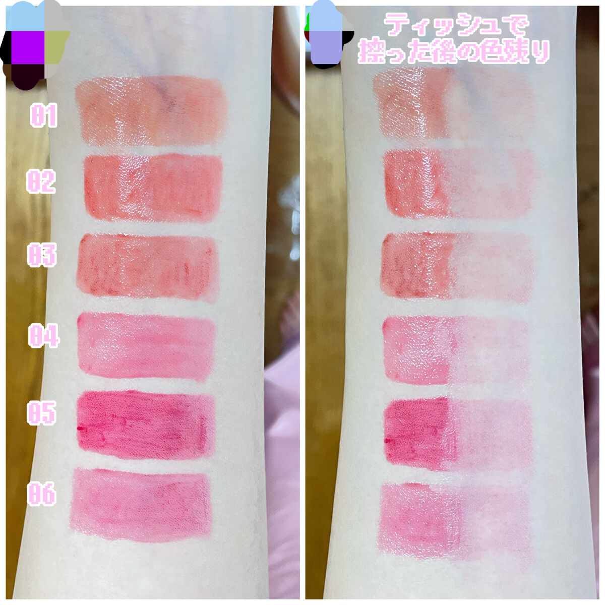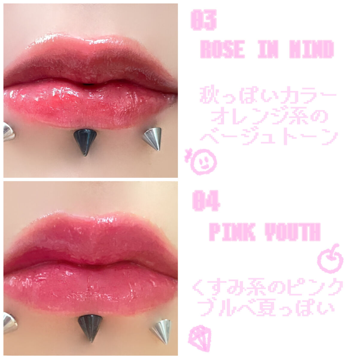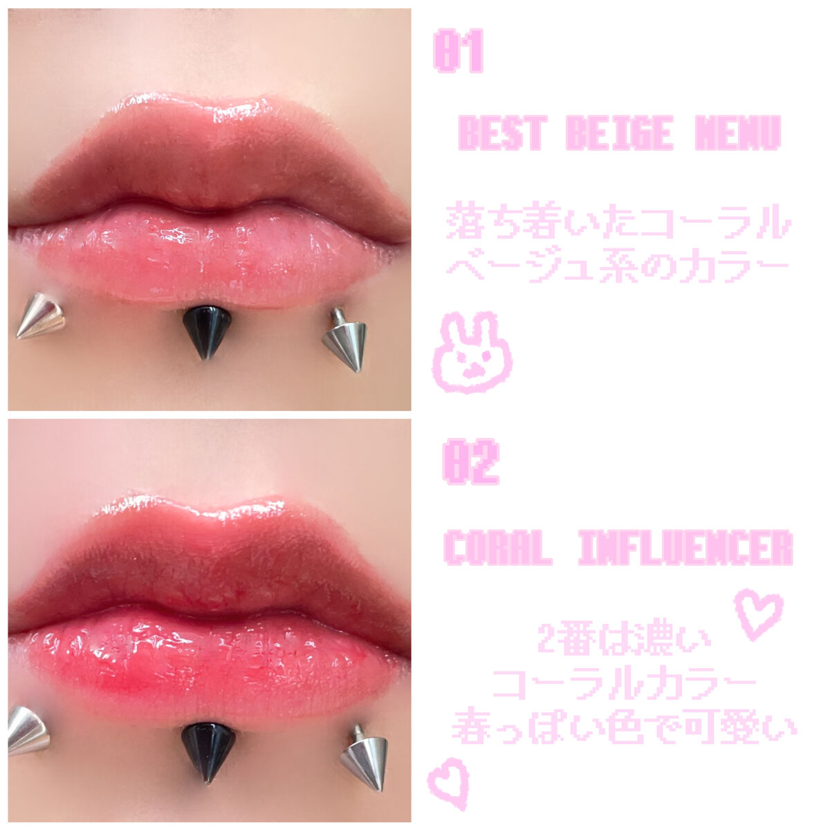 - <01 BEST BEIGE MENU(推し杏子ベージュ)> 水、ジフェニルジメチコン、リンゴ酸ジイソステアリル、ビスジグリセリルボリアシルアジペート-2、水添ポリイソブテン、ダイマー ジリノール酸ダイマージリノレイルビス(ベヘニル/イソステアリル/フィトステリル)、ジグリセリン、セチルPEG/PPG-10/1ジメチコン、DPG、水添ポリ (C6-14 オレフィン)、ポリソルベート60、イソステアリン酸ソルビタン、ダイマージリノール酸ジイソステアリン酸ポリ グリセリル-3、ペンチレングリコール、(アクリル酸ヒドロキシエチル/アクリロイルジメチルタウリンNa)コポリマー、トリ(カプリル酸/ カプリン酸)グリセリル、スクワラン、セテアレス-20、(エチレン/プロピレン)コポリマー、フェノキシエタノール、グリセリン、ポリグリ セリン-3、香料、エチルヘキシルグリセリン、ハマメリス葉エキス、オニユリエキス、BG、酸化チタン、黄5、赤227、赤104(1)、青1 <02 CORAL INFLUENCER(イエベ必須コーラル)> 水、ジフェニルジメチコン、リンゴ酸ジイソステアリル、ビスジグリセリルボリアシルアジペート-2、水添ポリイソブテン、ダイマー ジリノール酸ダイマージリノレイルビス(ベヘニル/イソステアリル/フィトステリル)、ジグリセリン、セチルPEG/PPG-10/1ジメチコン、DPG、水添ポリ (C6-14 オレフィン)、ポリソルベート60、イソステアリン酸ソルビタン、ダイマージリノール酸ジイソステアリン酸ポリ グリセリル-3、ペンチレングリコール、(アクリル酸ヒドロキシエチル/アクリロイルジメチルタウリンNa)コポリマー、トリ(カプリル酸/ カプリン酸)グリセリル、スクワラン、セテアレス-20、(エチレン/プロピレン)コポリマー、フェノキシエタノール、グリセリン、ポリグリ セリン-3、香料、エチルヘキシルグリセリン、ハマメリス葉エキス、オニユリエキス、BG、酸化チタン、黄5、赤227、赤104(1)、青1 <03 ROSE IN MIND(いいねローズ)> 水、ジフェニルジメチコン、リンゴ酸ジイソステアリル、ビスジグリセリルポリアシルアジペート-2、水添ポリイソブテン、ダイマージリノール酸ダイマージリノレイルビス(ベヘニル/イソステアリル/フィトステリル)、ジグリセリン、DPG、セチルPEG/PPG-10/1ジメチコン、水添ポリデセン、ポリソルベート60、イソステアリン酸ソルビタン、ダイマージリノール酸ジイソステアリン酸ポリグリセリル-3、ペンチレングリコール、(アクリル酸ヒドロキシエチル/アクリロイルジメチルタウリンNa)コポリマー、トリ(カプリル酸/カプリン酸)グリセリル、スクワラン、セテアレス-20、(エチレン/プロピレン)コポリマー、フェノキシエタノール、グリセリン、香料、エチルヘキシルグリセリン、ハマメリス葉エキス、オニユリエキス、BG、テトラ(ジ-t-ブチルヒドロキシヒドロケイヒ酸)ペンタエリスリチル、酸化チタン、黄5、赤104(1)、赤227、青1 <04 PINK YOUTH(ベイビー天使)> 水、ジフェニルジメチコン、リンゴ酸ジイソステアリル、ビスジグリセリルボリアシルアジペート-2、水添ポリイソブテン、ダイマー ジリノール酸ダイマージリノレイルビス(ベヘニル/イソステアリル/フィトステリル)、ジグリセリン、セチルPEG/PPG-10/1ジメチコン、DPG、水添ポリ (C6-14オレフィン)、ポリソルベート60、イソステアリン酸ソルビタン、ダイマージリノール酸ジイソステアリン酸ポリ グリセリル-3、ペンチレングリコール、(アクリル酸ヒドロキシエチル/アクリロイルジメチルタウリンNa)コポリマー、トリ(カプリル酸/ カプリン酸)グリセリル、スクワラン、セテアレス-20、(エチレン/プロピレン)コポリマー、フェノキシエタノール、ポリグリセリン-3、香料、エチルヘキシルグリセリン、グリセリン、水酸化Al、ポリアクリル酸アンモニウム、BG、ハマメリス葉エキス、オニユリエキス、酸化チタン、赤227、黄4、赤104 (1) 黄5、青1 <05 CHERRY SO WHAT(どうしたのチェリー)> 水、ジフェニルジメチコン、リンゴ酸ジイソステアリル、ビスジグリセリルポリアシルアジペート-2、水添ポリイソブテン、ダイマージリノール酸ダイマージリノレイルビス(ベヘニル/イソステアリル/フィトステリル)、ジグリセリン、セチルPEG/PPG-10/1ジメチコン、DPG、水添ポリ(C6-14オレフィン)、ポリソルベート60、イソステアリン酸ソルビタン、ダイマージリノール酸ジイソステアリン酸ポリグリセリル-3、ペンチレングリコール、(アクリル酸ヒドロキシエチル/アクリロイルジメチルタウリンNa)コポリマー、トリ(カプリル酸/カプリン酸)グリセリル、スクワラン、セテアレス-20、(エチレン/プロピレン)コポリマー、フェノキシエタノール、ポリグリセリン-3、香料、エチルヘキシルグリセリン、グリセリン、ハマメリス葉エキス、オニユリエキス、BG、赤227、黄4、赤104(1)、黄5、青1 <06 PLUM UPDATE(プロフ写プラム)> 水、ジフェニルジメチコン、リンゴ酸ジイソステアリル、ビスジグリセリルポリアシルアジペート-2、水添ポリイソブテン、ダイマー ジリノール酸ダイマージリノレイルビス(ベヘニル/イソステアリル/フィトステリル)、