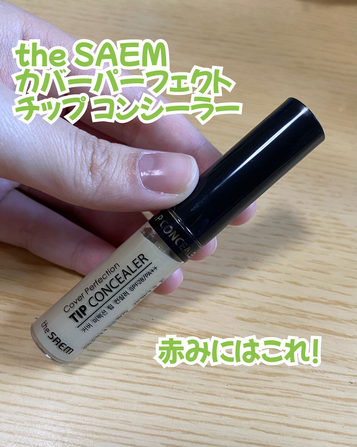 theSAEMカバーパーフェクションチップコンシーラーグリーンベージュザセムのコンシーラーはずっとリピートしていて、グリーンベージュは下地を塗った後ニキビ跡などの赤み消し用に使用チップは大きめでしっかり多めにつくので、細かい塗布は難しい緑色で...