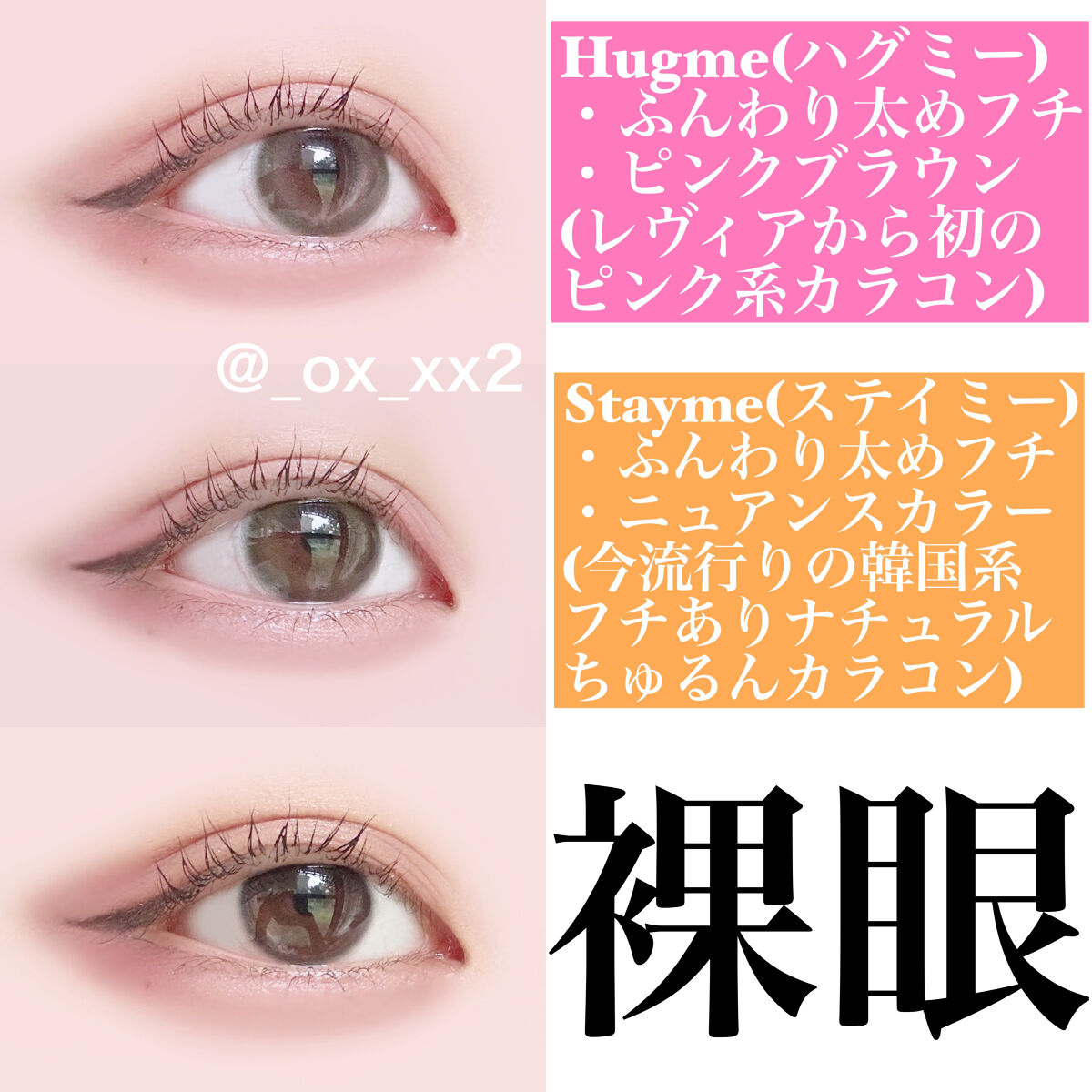 レヴィアのカラコンは瞳に光が入ってキラキラして見えるのでお気に入り♡ 奥目の方にもおすすめしたいカラコンです☺️ 着色直径 : 13,4mm 外側はふんわりオリーブグレー、内側は明るすぎないナチュラルなブラウン。 他には中々ない絶妙な色味が可愛くて、黒目でも茶目でも使いやすい!! ちゅるんとしたピンクブラウンカラー。甘めなピンク系のメイクにもぴったりな、ほろ甘カラコン。瞳の中にピンクのラインがうっすら入ってめちゃめちゃかわいいです♡
