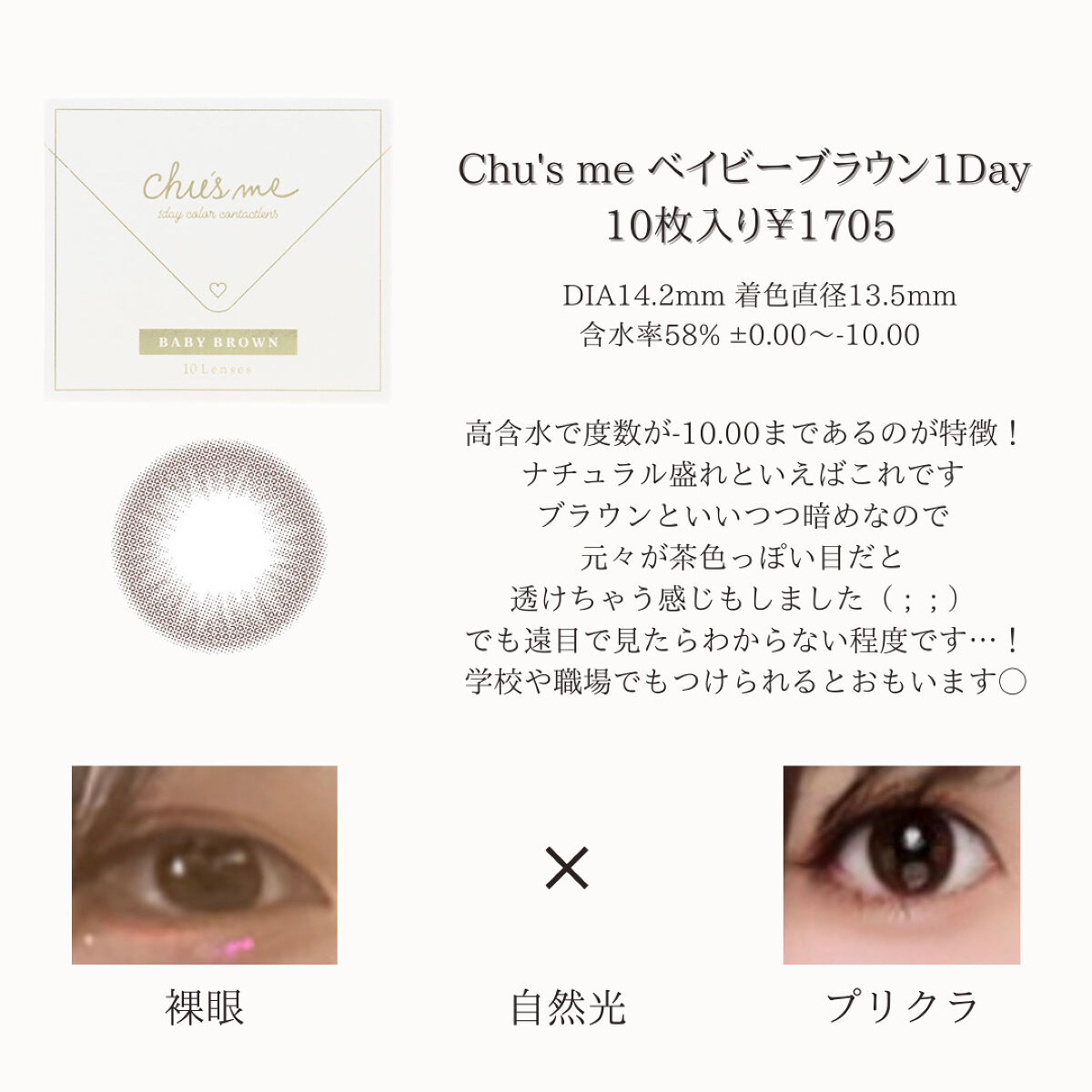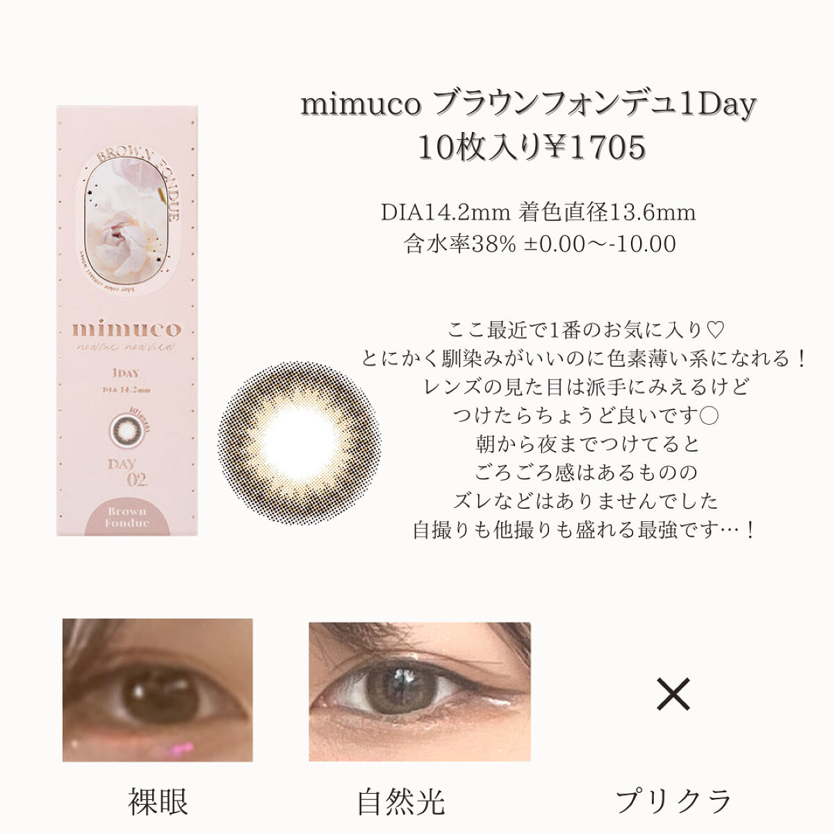 eye closet 1DAY CLEAR BEIGE カラコン初心者さん、バレたくないけど色素薄くなりたい方におすすめ🫰🏿 MOLAK ティントブラウン 自然に目を大きくしたい方、目の色をナチュラルに明るくしたい方におすすめ◯ Chu's me BABY BROWN 学校や職場でも使いたい方、特に目の色がもともと濃くて色素薄くしたい方におすすめ🫶🏿 mimuco ブラウンフォンデュ 色素薄くなりたい方、特別な日やたくさん写真を撮る日におすすめ🤍