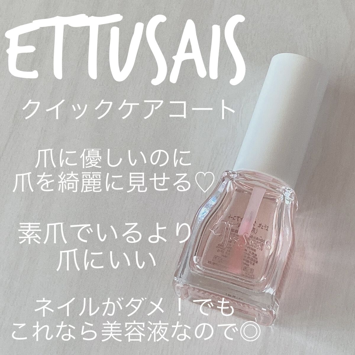 【リムーバー不要】エテュセクイックケアコートを試してみました。リムーバー不要で重ねて塗れるみたいです。▫️薄膜ヴェールで弱い爪を保護し、爪のカケ割れ・2枚爪・乾燥を防ぎます。ほんのりピンク色で爪磨きをしたようなツヤ仕上げになります。実際の使用...
