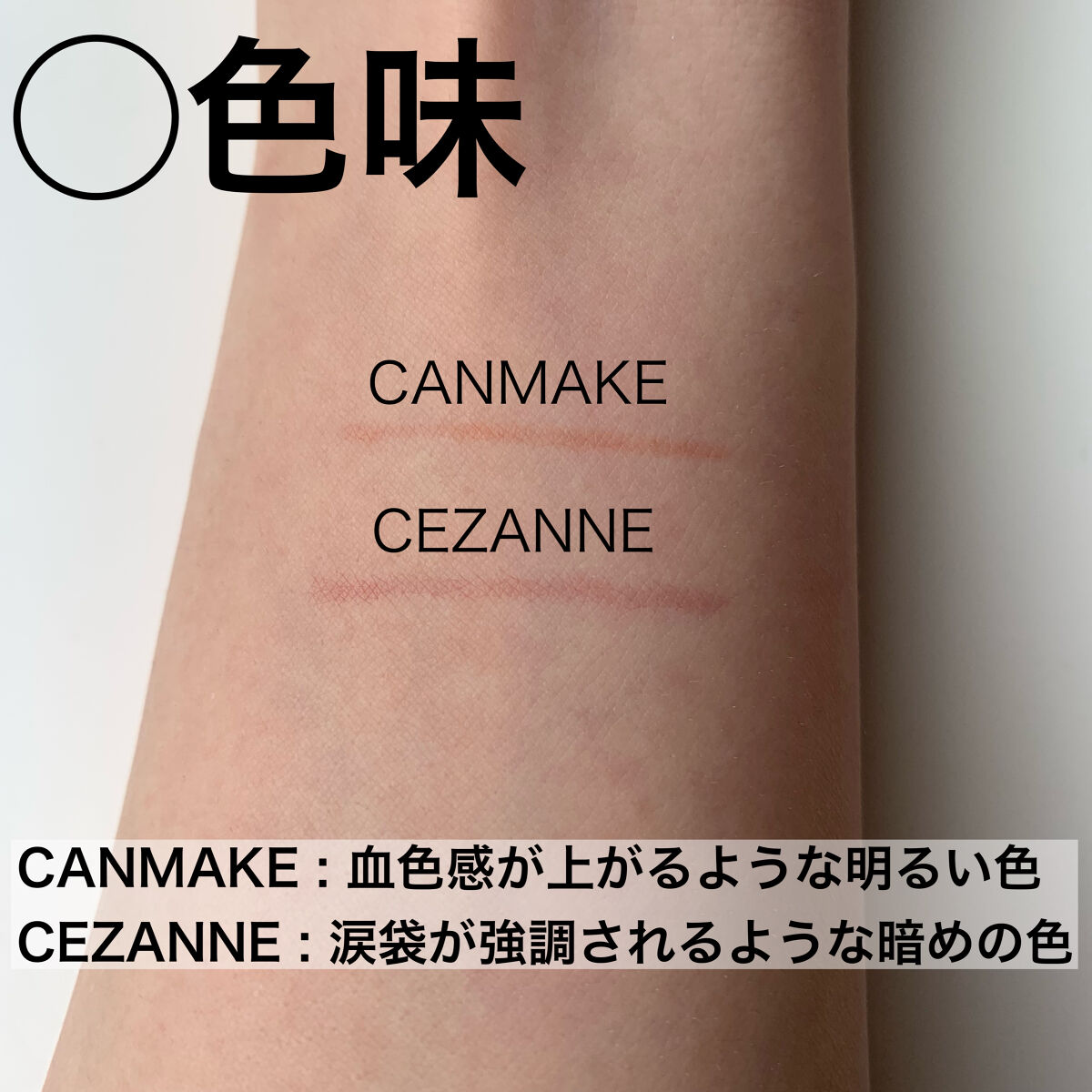 筆の細さはキャンメイクの勝ち! CANMAKEの方が筆が細いので、調整次第で自然な涙袋を演出できます。 発色のよさはセザンヌの勝ち! セザンヌの方が発色がいいので、一筆でしっかりと涙袋を書くことが出来ます! お値段はCEZANNEの勝ち! 110円分、CEZANNEの方が安いです!!