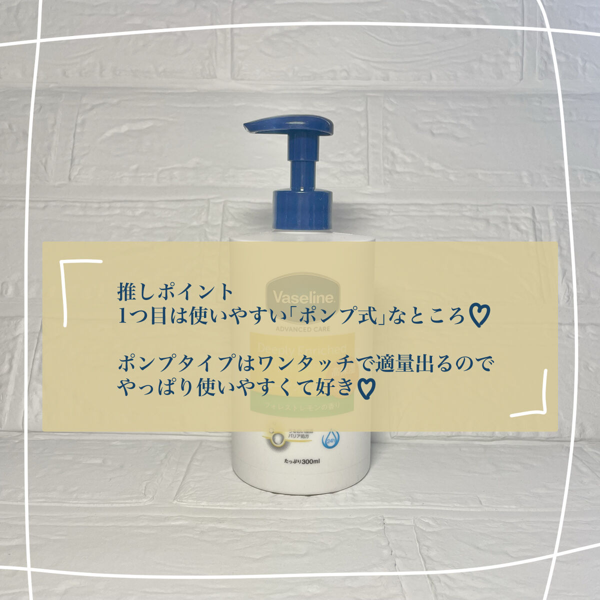 【使った商品】ヴァセリンディープリーエンリッチドボディローションフォレストレモンの香り ¥990【商品の特徴】💛うるおいをしっかり閉じ込める高保湿ボディローション。ふんわり優しく爽やかに香ってリフレッシュできるフォレストレモンの香り。コラーゲ...
