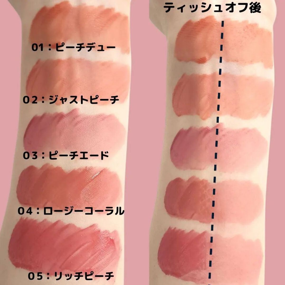 糖度の高い7つのフルーツカラー🍑🍓🍎🍊 色味だけでなく、香りまでフルーツなので使う度に気分も上がる!!!🥰✨ ジュワッとぷるぷるな付け心地❣️ 持続力が高くて、拭き取ってもしっかりと色味が残ってます👌💛