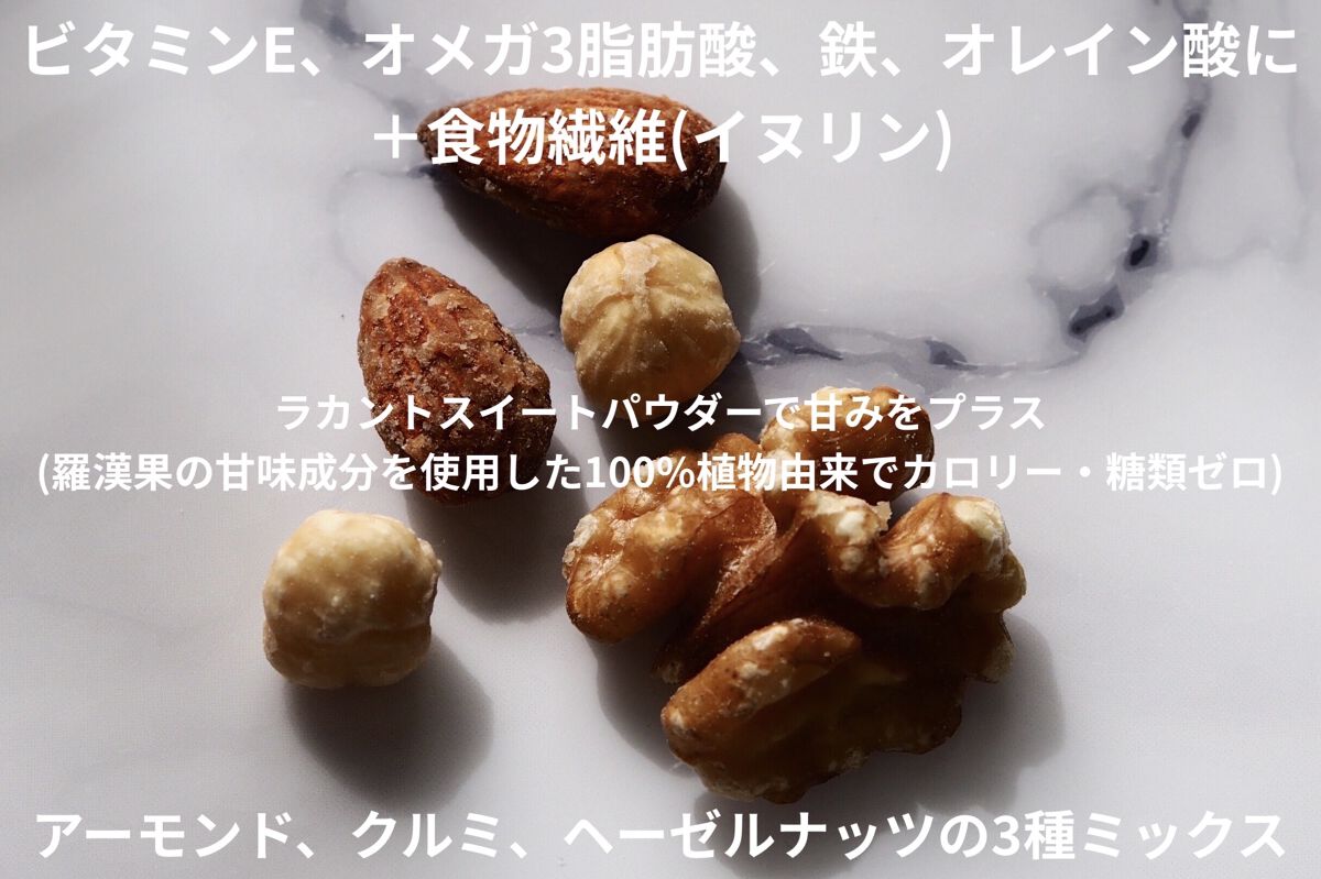 ♡アーモンド、クルミ、ヘーゼルナッツの3種ミックス ♡100%植物由来でカロリー・糖類ゼロの”ラカントスイートパウダー“をコーティング ♡手に粉がつきにくい ♡ビタミンE、オメガ3脂肪酸、鉄、オレイン酸+食物繊維(イヌリン)と栄養たっぷり 低糖質なのに、ラカントの自然な甘みが美味しいミックスナッツ。 私はクルミが大大大好きなので、ごろっと大きめのクルミが入っているのが嬉しい✨ カリッとした歯応えも◎ 15gの食べ切りサイズが10袋入り。 このサイズ感が、ちょっとお腹が空いたときにちょうどいいです。 糖質が気になる方はもちろん、ビタミンEや鉄など不足しがちな栄養素を補給したい方にもおすすめです!