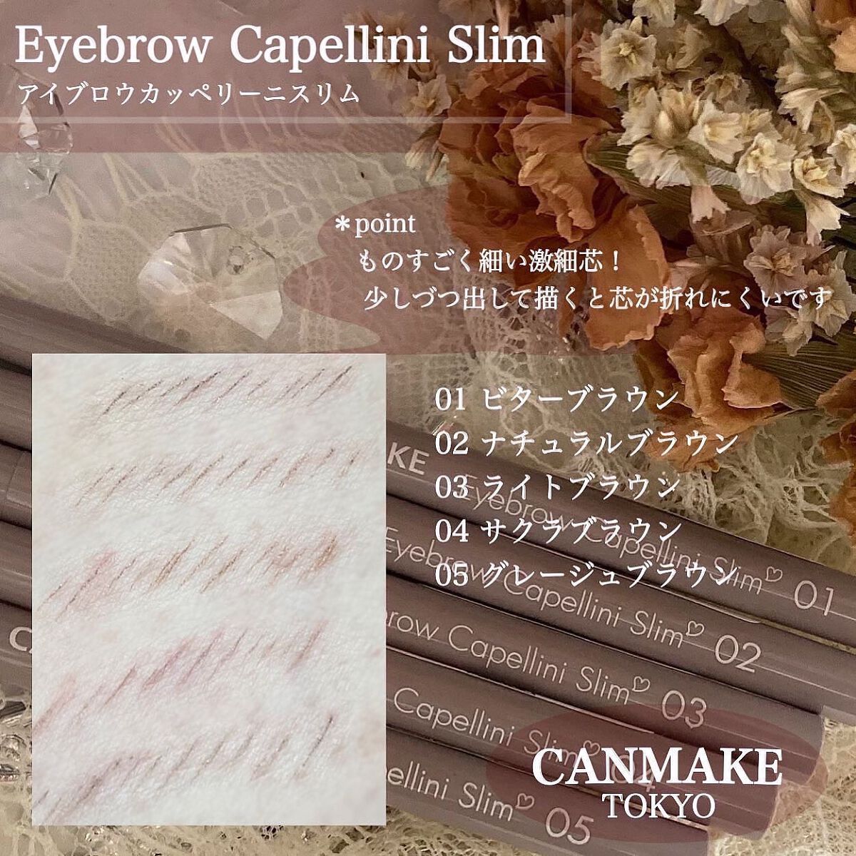 - サロン級の眉が描ける! 眉尻や輪郭がぼやけない、0.97mmの激細芯アイブロウ “カッペリーニ”とは? パスタの一種で、直径1mm前後の非常に細いもの。 イタリア語で“髪の毛”を意味する「Capelli(カペッリ)」が由来だと言われています。 本製品は、カッペリーニのような細さの芯が特長です。 適度な硬さの激細芯で、眉毛を1本1本生やすように描ける! 眉の輪郭も取りやすく、仕上がりはまるでサロン級…⁉