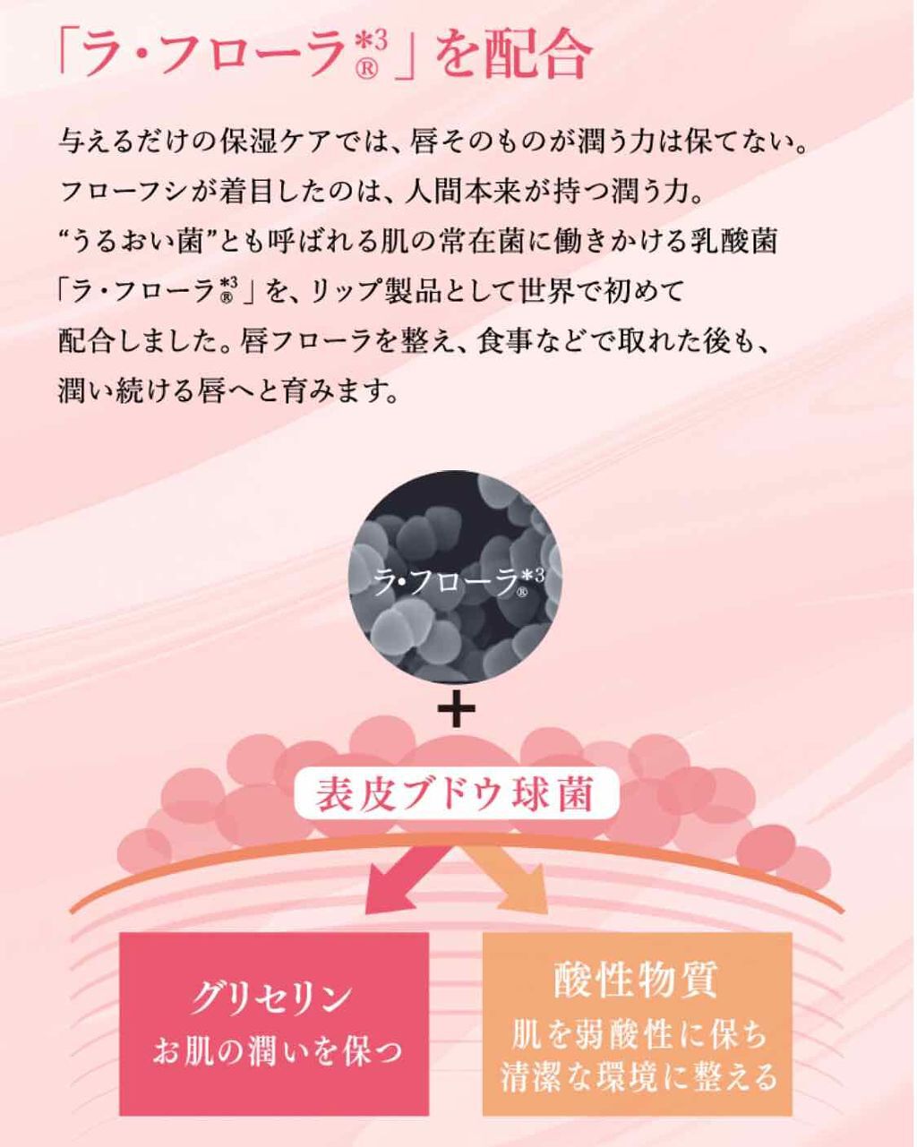 - 〇乳酸菌「ラ・フローラ EC-12(保湿)」を約300億個以上配合。 〇唇を健やかに保つ天然ミネラル成分を配合。 〇リップバーム & リップグロスのハイブリッド処方。 低刺激性(アレルギーテスト済・パッチテスト済)* UZU is 100% cruelty-free. パラベンフリー / タルクフリー / 無香料 *全ての方にアレルギーや皮膚刺激が発生しないということではありません
