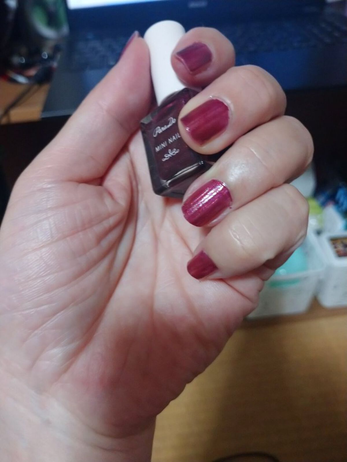 パラドゥミニネイルを使って 赤色のハーフネイル。 ベースコートを塗って RE12を全体に1度塗り。 乾いてから爪先半分を目安に RD09を1度塗りして トップコートを重ねて完成。 RD12は透け感のある赤色。 RD09はキラキラパールたっぷり...