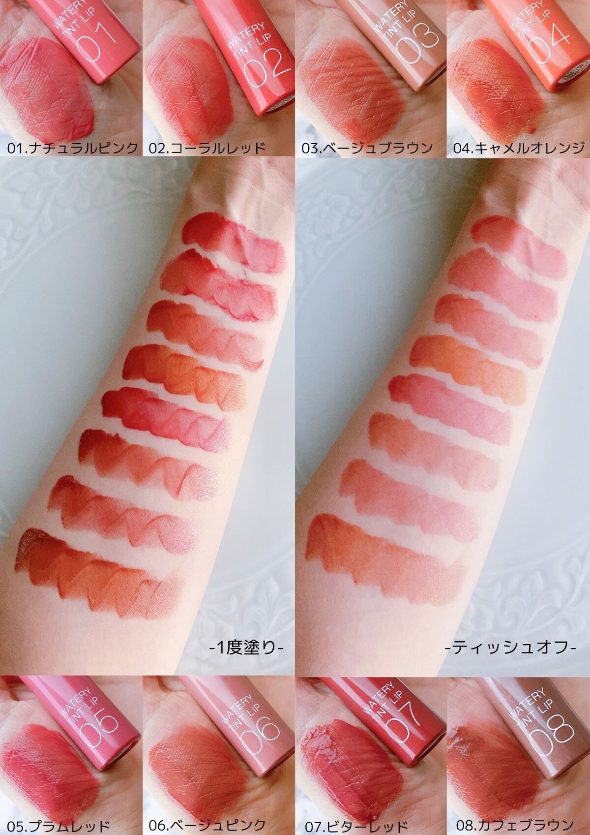 塗った瞬間からみずみずしいウォータリーなツヤが魅力のリップ💄💕 濡れたようなツヤツヤリップに仕上がります🥰 ベタベタせず使いやすく、ティッシュオフすると落ちにくいです🙋🏻♀️✨ 濃いブラウンですが透け感があるので思ったより使いやすいです😊