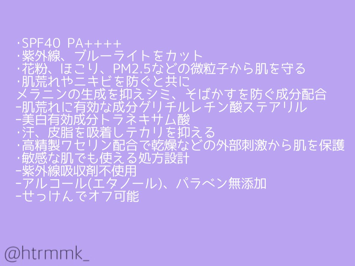 〇SPF35 PA+++ 〇肌なじみがよくヨレにくい 〇ヒアルロン酸配合で乾燥しにくい 〇紫外線吸収剤フリーのノンケミカル処方 ナチュラル(自然な肌色) オークル(日焼けした肌色) ピンクオークル(透明感のある肌色) 質感はセミマットとマットの間くらいなイメージ