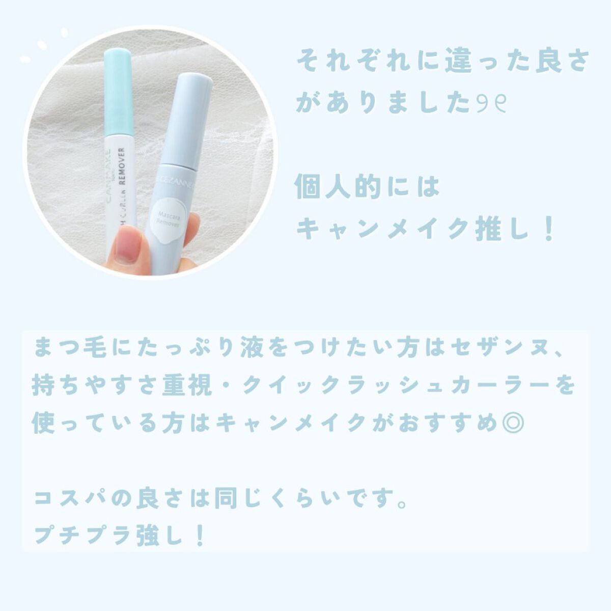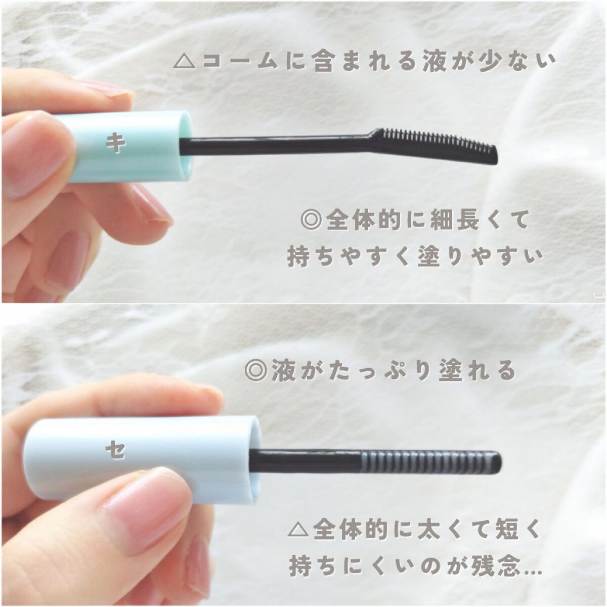 キャンメイクの方が優秀でした…! キャンメイクは持ち手の安定感が素晴らしかったです👏🏻 キャンメイクは細かめのコームなので液の含みがセザンヌに比べて少なく、まつ毛にたっぷり液を付けたい私には少し物足りなく感じてしまいました💦 セザンヌは写真を見て頂ければ分かるように、たっぷりと液を付けることができます! 液の質感や落ちやすさについてはあまり大きな違いは感じませんでした😌 1度にたっぷりと液を付けたいならセザンヌ、持ちやすさ・塗りやすさ重視、クイックラッシュカーラーを使っている方はキャンメイクをおすすめしたいです! 液含みに少し物足りなさは感じるものの、塗りやすさが圧倒的に優秀だったキャンメイクを個人的には推しています☺️🤍