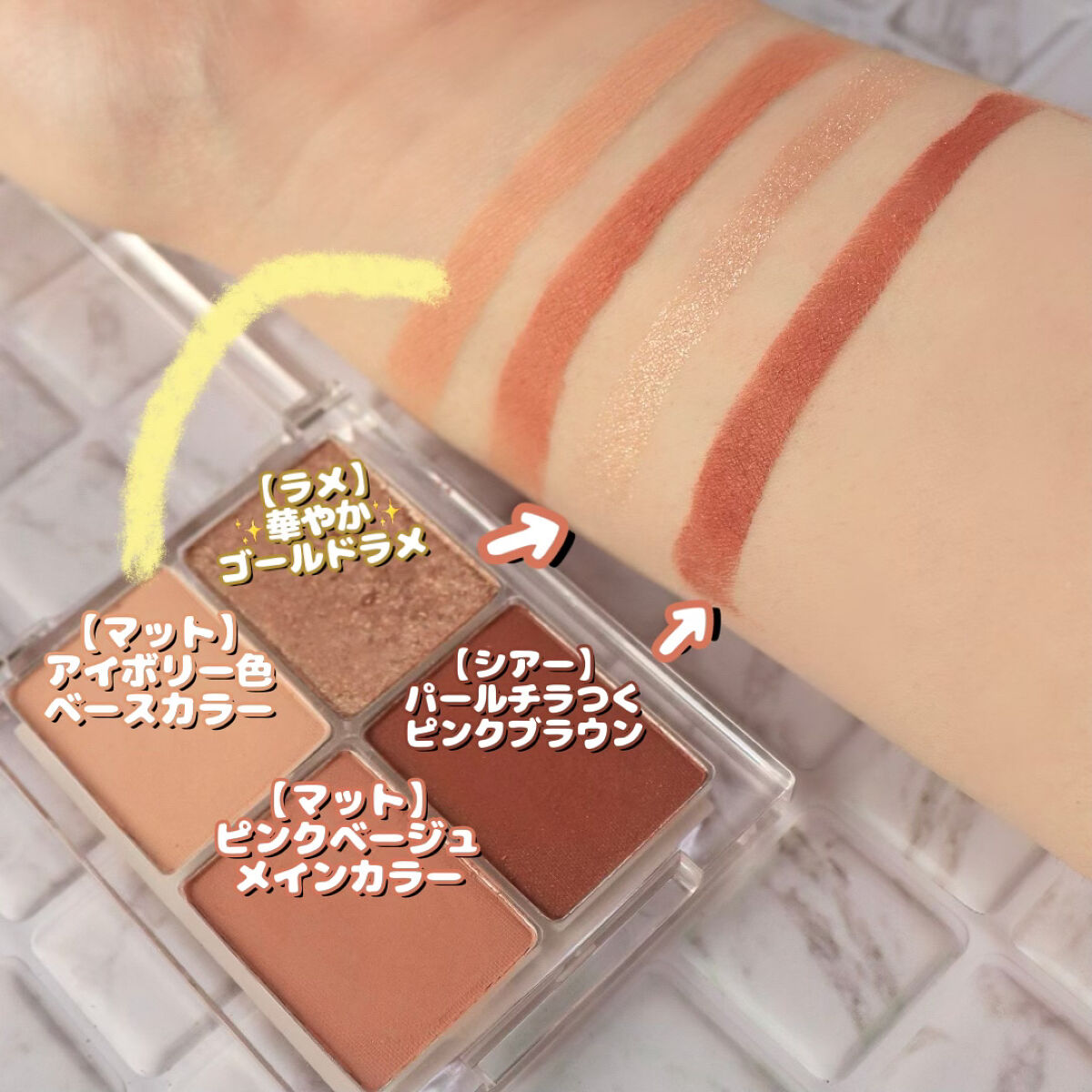 コーラルピンクやくすみ過ぎないレッドが入っているパレット! ラメがイエローラメですごく可愛い! コーラルピンクとレッドのアイシャドウはラメ入りとマットタイプがあって気分に合わせて色んなメイクが出来ます お気に入りポイントは右上のホワイトシルバーのようなカラーにパールがたくさん入っていて涙袋に塗るとぷっくり見えるところ! カラーは一見濃く見えますがテクスチャーが柔らかく、発色は控えめでふんわり発色です 春メイクやピンクメイクがお好きな方にオススメしたい話題のアイシャドウでした!