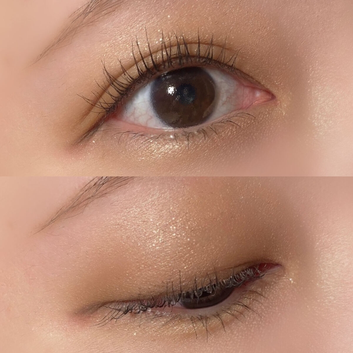 このメタリックマスカラは、コームが特殊! 極細のメタルコームで、0.45mm間隔の均一なピッチ。 程よく数本のまつ毛を束ねてくれて、綺麗な束になるの! コームは2.5mmとかなり細めなので、目頭や目尻が塗りやすいのはもちろん、下まつげも束が作りやすいの✨ 液がゆるめだから、重ね塗りしてもダマになりにくかったよ◎ 一度塗りだとわりと自然な仕上がりだから、重ね塗りして自分の好みの束感作ってみてね🫧 カールキープ力はしっかりあって、カールは落ちにくかった◎ 滲んだりとかもなかったよ! このマスカラの値段はなんと990円と1,000円以下なの…! この値段で綺麗な束感まつ毛が作れちゃうのすごすぎる〜!コスパ良い❤️🔥 現在は、クリアブラックのみがPLAZA・MINiPLAで先行販売です*̩̩̥ 1月からは全国的に販売されるよ🥰 クリアブラックに加えて、ブラウンも発売されるみたい!全2色展開! 限定のようなので、気になる方は売り切れちゃう前に要チェックだよ〜!!