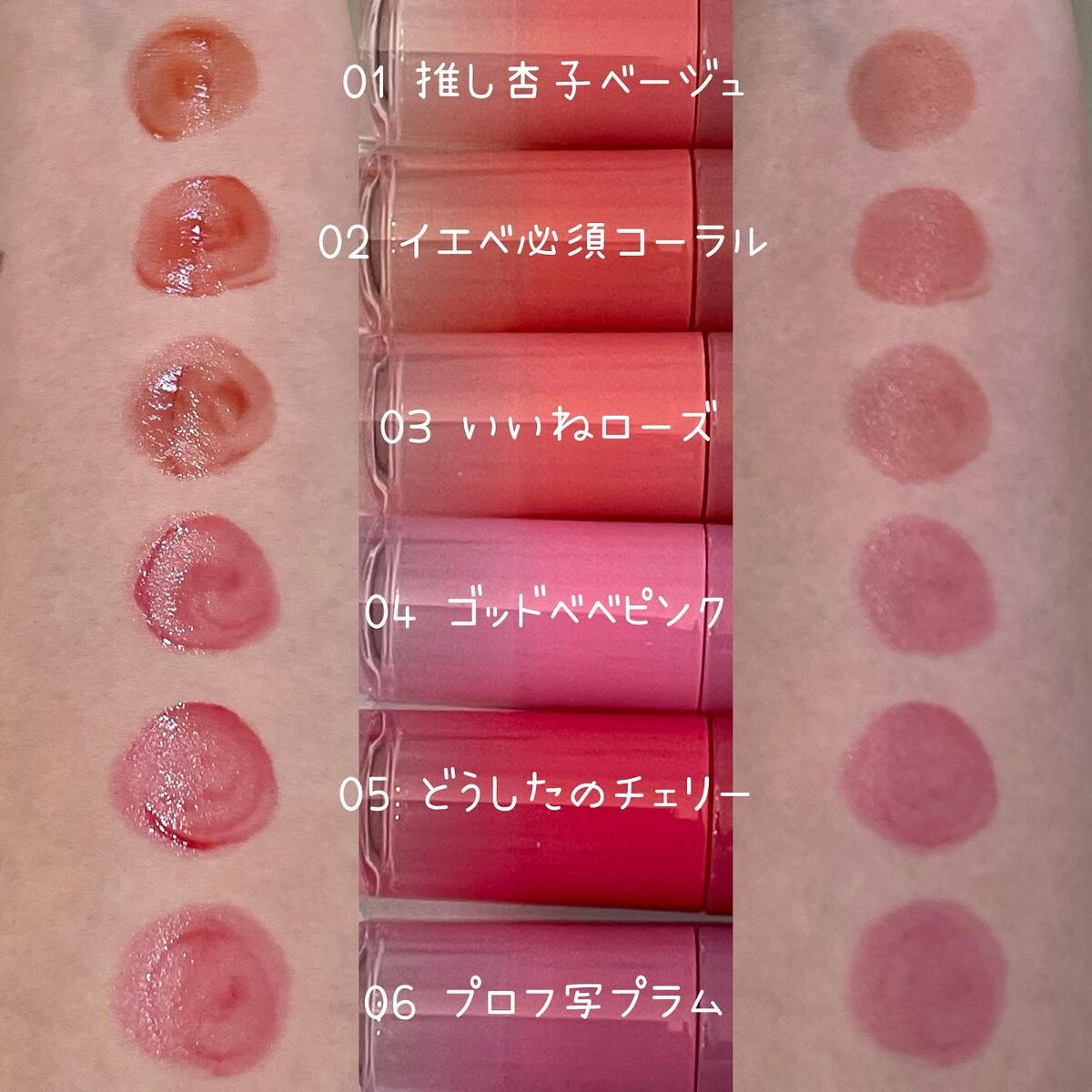 - <01 BEST BEIGE MENU(推し杏子ベージュ)> 水、ジフェニルジメチコン、リンゴ酸ジイソステアリル、ビスジグリセリルボリアシルアジペート-2、水添ポリイソブテン、ダイマー ジリノール酸ダイマージリノレイルビス(ベヘニル/イソステアリル/フィトステリル)、ジグリセリン、セチルPEG/PPG-10/1ジメチコン、DPG、水添ポリ (C6-14 オレフィン)、ポリソルベート60、イソステアリン酸ソルビタン、ダイマージリノール酸ジイソステアリン酸ポリ グリセリル-3、ペンチレングリコール、(アクリル酸ヒドロキシエチル/アクリロイルジメチルタウリンNa)コポリマー、トリ(カプリル酸/ カプリン酸)グリセリル、スクワラン、セテアレス-20、(エチレン/プロピレン)コポリマー、フェノキシエタノール、グリセリン、ポリグリ セリン-3、香料、エチルヘキシルグリセリン、ハマメリス葉エキス、オニユリエキス、BG、酸化チタン、黄5、赤227、赤104(1)、青1 <02 CORAL INFLUENCER(イエベ必須コーラル)> 水、ジフェニルジメチコン、リンゴ酸ジイソステアリル、ビスジグリセリルボリアシルアジペート-2、水添ポリイソブテン、ダイマー ジリノール酸ダイマージリノレイルビス(ベヘニル/イソステアリル/フィトステリル)、ジグリセリン、セチルPEG/PPG-10/1ジメチコン、DPG、水添ポリ (C6-14 オレフィン)、ポリソルベート60、イソステアリン酸ソルビタン、ダイマージリノール酸ジイソステアリン酸ポリ グリセリル-3、ペンチレングリコール、(アクリル酸ヒドロキシエチル/アクリロイルジメチルタウリンNa)コポリマー、トリ(カプリル酸/ カプリン酸)グリセリル、スクワラン、セテアレス-20、(エチレン/プロピレン)コポリマー、フェノキシエタノール、グリセリン、ポリグリ セリン-3、香料、エチルヘキシルグリセリン、ハマメリス葉エキス、オニユリエキス、BG、酸化チタン、黄5、赤227、赤104(1)、青1 <03 ROSE IN MIND(いいねローズ)> 水、ジフェニルジメチコン、リンゴ酸ジイソステアリル、ビスジグリセリルポリアシルアジペート-2、水添ポリイソブテン、ダイマージリノール酸ダイマージリノレイルビス(ベヘニル/イソステアリル/フィトステリル)、ジグリセリン、DPG、セチルPEG/PPG-10/1ジメチコン、水添ポリデセン、ポリソルベート60、イソステアリン酸ソルビタン、ダイマージリノール酸ジイソステアリン酸ポリグリセリル-3、ペンチレングリコール、(アクリル酸ヒドロキシエチル/アクリロイルジメチルタウリンNa)コポリマー、トリ(カプリル酸/カプリン酸)グリセリル、スクワラン、セテアレス-20、(エチレン/プロピレン)コポリマー、フェノキシエタノール、グリセリン、香料、エチルヘキシルグリセリン、ハマメリス葉エキス、オニユリエキス、BG、テトラ(ジ-t-ブチルヒドロキシヒドロケイヒ酸)ペンタエリスリチル、酸化チタン、黄5、赤104(1)、赤227、青1 <04 PINK YOUTH(ベイビー天使)> 水、ジフェニルジメチコン、リンゴ酸ジイソステアリル、ビスジグリセリルボリアシルアジペート-2、水添ポリイソブテン、ダイマー ジリノール酸ダイマージリノレイルビス(ベヘニル/イソステアリル/フィトステリル)、ジグリセリン、セチルPEG/PPG-10/1ジメチコン、DPG、水添ポリ (C6-14オレフィン)、ポリソルベート60、イソステアリン酸ソルビタン、ダイマージリノール酸ジイソステアリン酸ポリ グリセリル-3、ペンチレングリコール、(アクリル酸ヒドロキシエチル/アクリロイルジメチルタウリンNa)コポリマー、トリ(カプリル酸/ カプリン酸)グリセリル、スクワラン、セテアレス-20、(エチレン/プロピレン)コポリマー、フェノキシエタノール、ポリグリセリン-3、香料、エチルヘキシルグリセリン、グリセリン、水酸化Al、ポリアクリル酸アンモニウム、BG、ハマメリス葉エキス、オニユリエキス、酸化チタン、赤227、黄4、赤104 (1) 黄5、青1 <05 CHERRY SO WHAT(どうしたのチェリー)> 水、ジフェニルジメチコン、リンゴ酸ジイソステアリル、ビスジグリセリルポリアシルアジペート-2、水添ポリイソブテン、ダイマージリノール酸ダイマージリノレイルビス(ベヘニル/イソステアリル/フィトステリル)、ジグリセリン、セチルPEG/PPG-10/1ジメチコン、DPG、水添ポリ(C6-14オレフィン)、ポリソルベート60、イソステアリン酸ソルビタン、ダイマージリノール酸ジイソステアリン酸ポリグリセリル-3、ペンチレングリコール、(アクリル酸ヒドロキシエチル/アクリロイルジメチルタウリンNa)コポリマー、トリ(カプリル酸/カプリン酸)グリセリル、スクワラン、セテアレス-20、(エチレン/プロピレン)コポリマー、フェノキシエタノール、ポリグリセリン-3、香料、エチルヘキシルグリセリン、グリセリン、ハマメリス葉エキス、オニユリエキス、BG、赤227、黄4、赤104(1)、黄5、青1 <06 PLUM UPDATE(プロフ写プラム)> 水、ジフェニルジメチコン、リンゴ酸ジイソステアリル、ビスジグリセリルポリアシルアジペート-2、水添ポリイソブテン、ダイマー ジリノール酸ダイマージリノレイルビス(ベヘニル/イソステアリル/フィトステリル)、