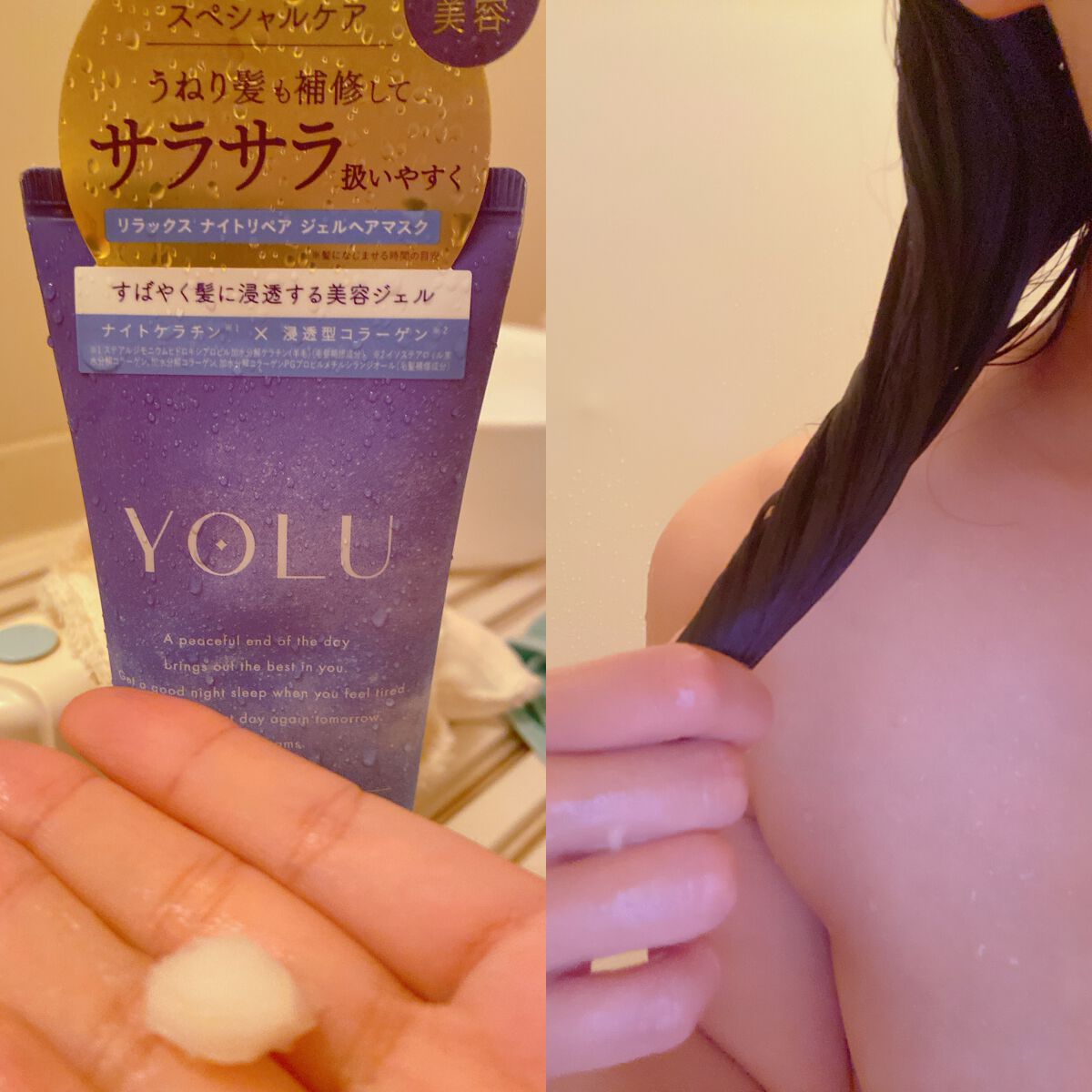 YOLU▶︎ヨルリラックスナイトリペアジェルヘアマスクリニューアル発売たった10秒*1スペシャルケアうねり髪も補修してサラサラ扱いやすく。新感覚、浸透型コラーゲン*2配合のジェルヘアマスク。ぷるんとした濃密なジェルが髪を包み込んで、洗い流した...