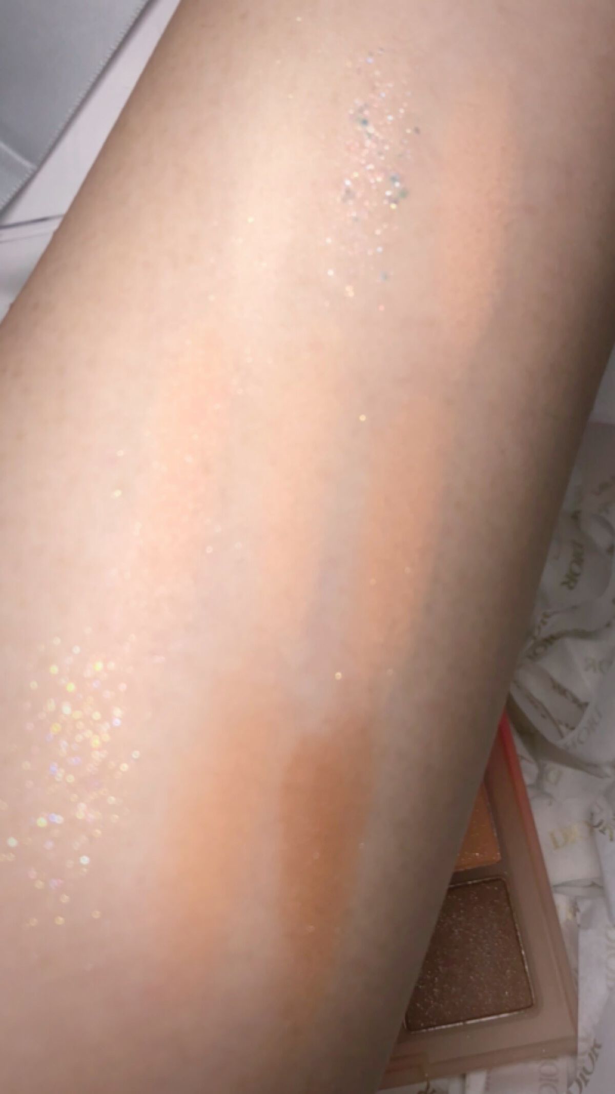 バームハイライトも入っている パレット珍しいですよね🫣 1番濃ゆい茶色のカラーで アイライン用カラーだなと思っていたのですが かなり淡い発色で、あかりんが アイホールに先に塗って使っていたのが 大正解なカラーでした!可愛い。 ラメ感もギラギラで可愛い。