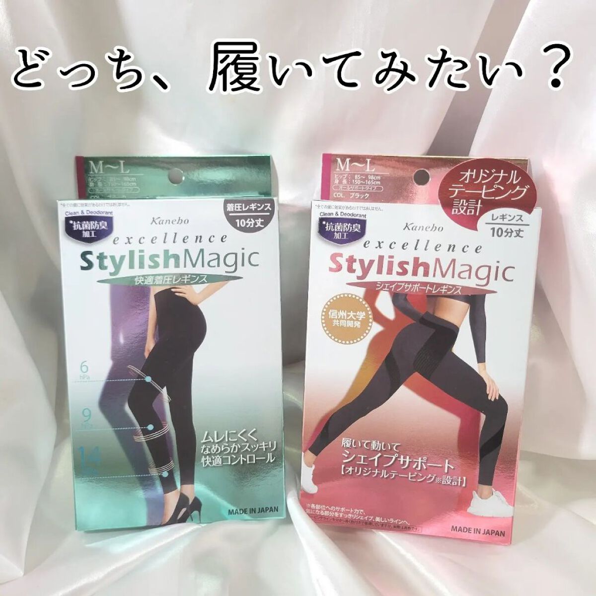 スタイリッシュマジック 快適着圧レギンスはサラッとした履き心地でむれにくく、苦しくなく名前の通り快適なレギンス✨ シェイプサポートレギンスはオリジナルのテーピングが筋肉の動きをアシスト!シェイプタイプのレギンスです🥰スタイリッシュマジック 快適着圧レギンスより少し着圧感が強めな感じがしましたが苦しくなく使えました٩(ˊᗜˋ*)و♪