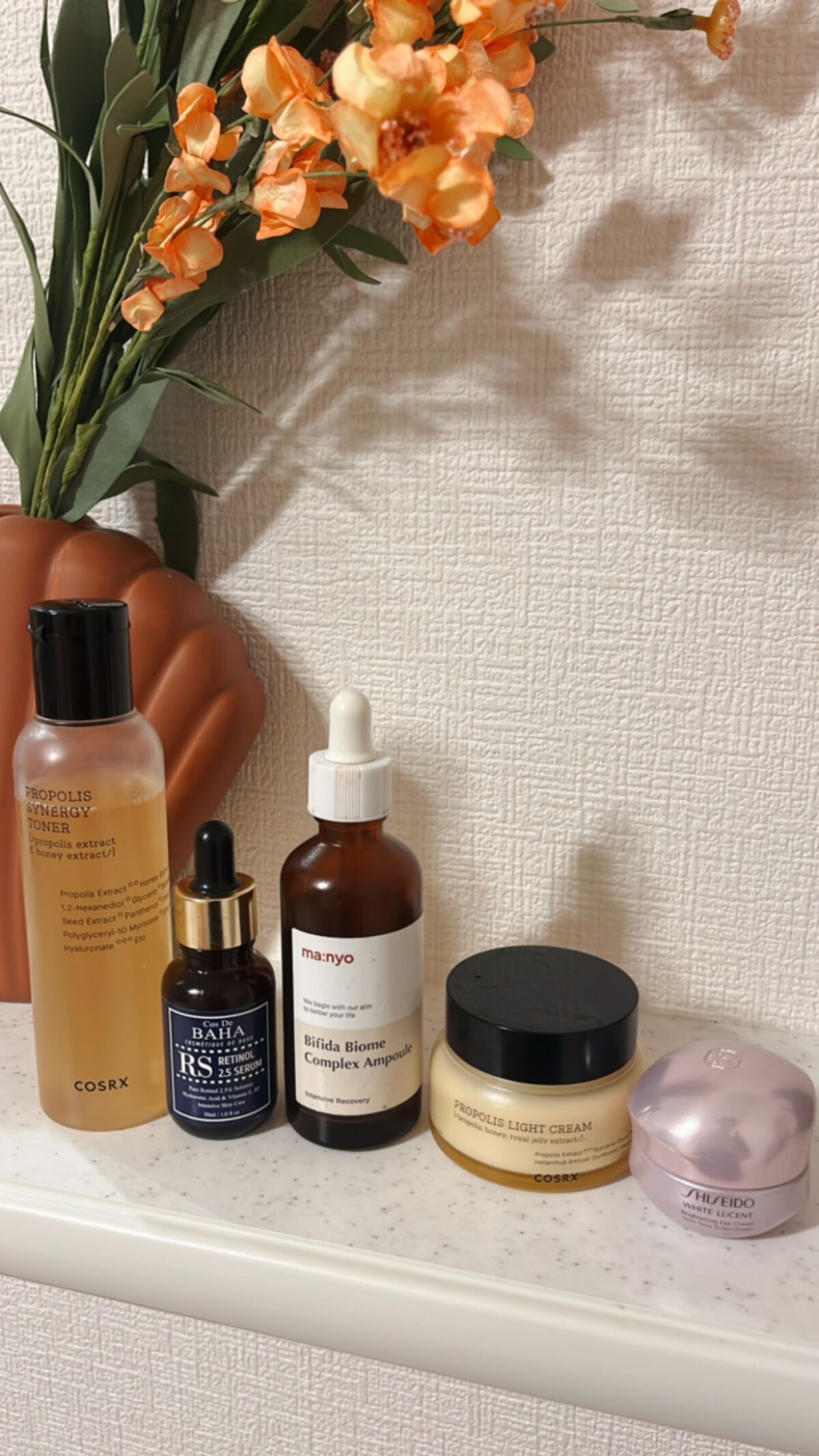洗顔後肌美精のレチノール配合のシートマスクをしその後生理前でもあるのでティルティルのシカ配合の化粧水で保湿を狙ってビタミン配合のアンプル塗り乳液とクリームでさらに保湿をアップみたいな感じでした! 毎日スキンケアしているおかげか、一日サボっても肌は元気です☺️