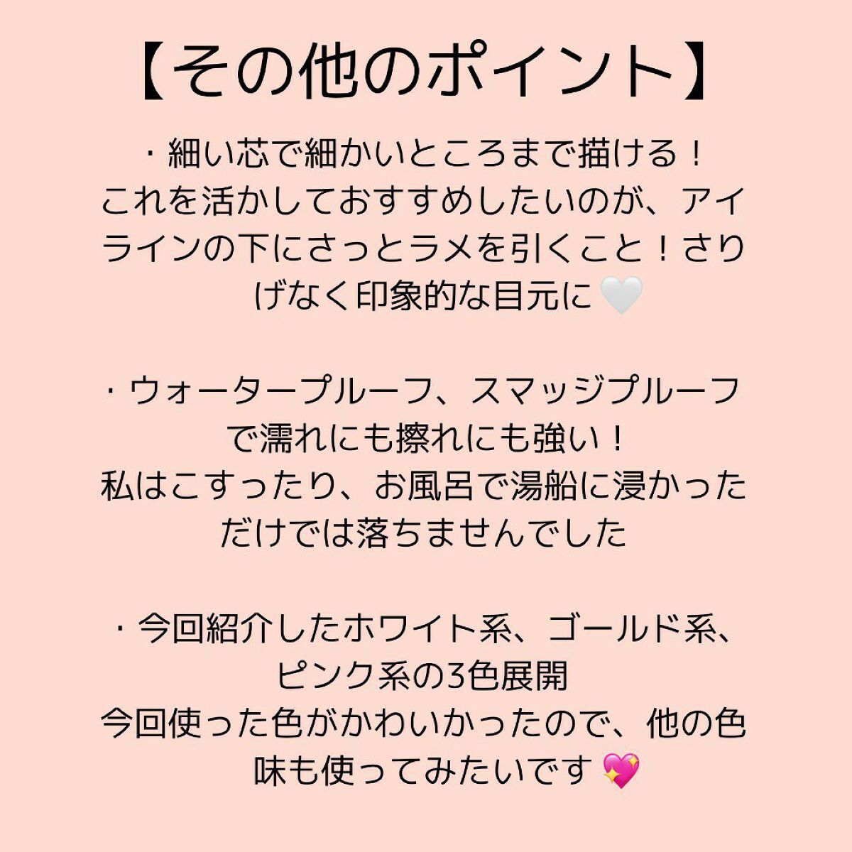 こちらはホワイト系、ゴールド系、ピンク系の3色展開です。 真っ白だと少し浮いてしまうかな…と思っていたのですが、紫っぽいので、透明感を出せて儚い目元にすることができます✨ ラメの大きさは小さめで、ぎらぎら感はあまりないです。控えめな小粒なラメです❕ おすすめの入れ方は涙袋はもちろん、黒目の上に入れることで縦幅拡張、目頭に入れると横幅拡張や奥目解消にぴったりです! またその他のポイントとしてウォータープルーフ、スマッジプルーフなので濡れ、こすれに強く、1日中よれることなく綺麗な目元が続きます。 ラメ飛びとかもないので、すごく扱いやすいです🥰🥰🥰