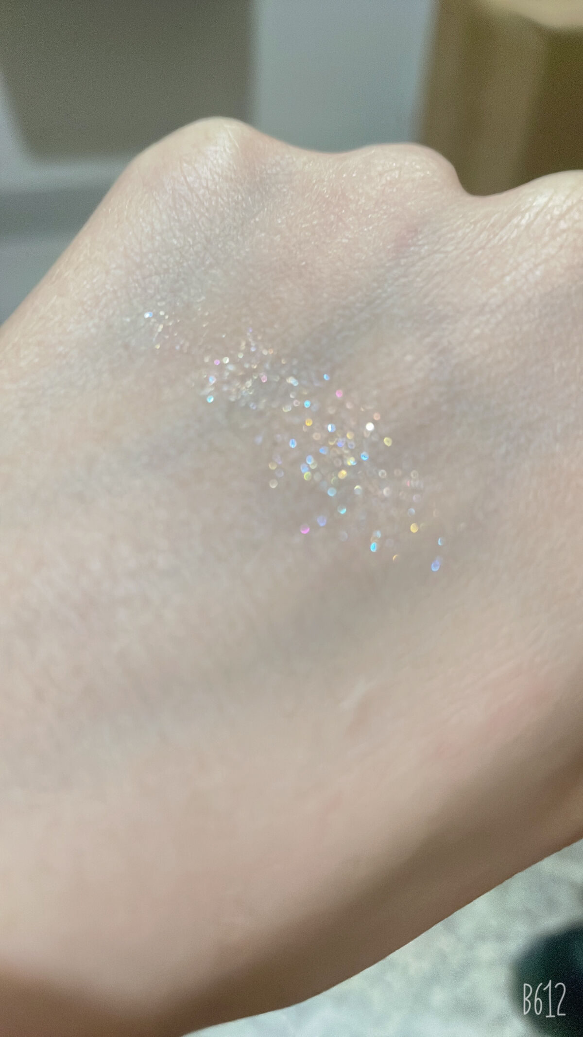 ラメが寒色系ラメで、黄緑のラメがキラキラっとしてて可愛いです😍 どんなメイクにも使いやすい色味かなと思います✨ グリッターなのでキランキランではありますが、 星屑のような小さな煌めきみたいな上品な輝き方をしているラメなので比較的に世代問わず誰でも使える、万能グリッターかなと思いました✨ 透明感も出しつつ、且つ垢抜けたい方にはこの色味は本当にオススメです❣️ 割と使いやすいと思うので是非気になった方は店頭などでも色味を確認してみて下さい☺️