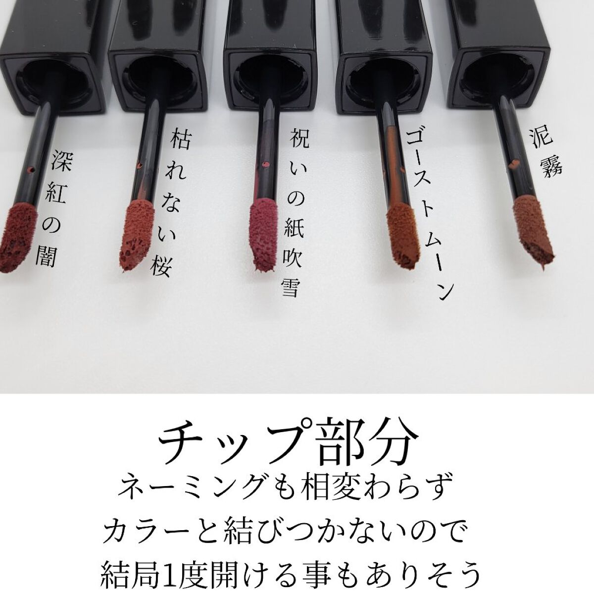 - <EX-1 蜜柑雲シフォン(限定)> ジメチコン、合成フルオロフロゴパイト、イソドデカン、メチルトリメチコン、シリカ、(ジメチコン/ビニルジメチコン)クロスポリマー、トリメチルシロキシケイ酸、(アクリレーツ/ジメチコン)コポリマー、ポリグリセリル-3ポリジメチルシロキシエチルジメチコン、パルミチン酸デキストリン、(ジビニルジメチコン/ジメチコン)コポリマー、ジステアルジモニウムヘクトライト、水、トリ(カプリル酸/カプリン酸)グリセリル、炭酸プロピレン、(C12,13)パレス-23、(C12,13)パレス-3、フェノキシエタノール、メチルパラベン、エチルパラベン、(+/-)酸化チタン、酸化鉄、水酸化Al、黄4、青1、赤202、赤226 <EX-2 羊雲のゆりかご(限定)> ジメチコン、合成フルオロフロゴパイト、イソドデカン、メチルトリメチコン、シリカ、(ジメチコン/ビニルジメチコン)クロスポリマー、トリメチルシロキシケイ酸、(アクリレーツ/ジメチコン)コポリマー、ポリグリセリル-3ポリジメチルシロキシエチルジメチコン、パルミチン酸デキストリン、(ジビニルジメチコン/ジメチコン)コポリマー、ジステアルジモニウムヘクトライト、水、トリ(カプリル酸/カプリン酸)グリセリル、炭酸プロピレン、(C12,13)パレス-23、(C12,13)パレス-3、フェノキシエタノール、メチルパラベン、エチルパラベン、(+/-)酸化チタン、酸化鉄、水酸化Al、黄4、青1、赤202、赤226 <M01 深紅の闇> ジメチコン、合成フルオロフロゴパイト、イソドデカン、メチルトリメチコン、シリカ、(ジメチコン/ビニルジメチコン)クロスポリマー、トリメチルシロキシケイ酸、(アクリレーツ/ジメチコン)コポリマー、ポリグリセリル-3ポリジメチルシロキシエチルジメチコン、パルミチン酸デキストリン、ジステアルジモニウムヘクトライト、(ジビニルジメチコン/ジメチコン)コポリマー、トリ(カプリル酸/カプリン酸)グリセリル、水、炭酸プロピレン、(C12,13)パレス-23、(C12,13)パレス-3、フェノキシエタノール、メチルパラベン、エチルパラベン、(+/-)酸化チタン、酸化鉄、水酸化Al、黄4、青1、赤202、赤226 <M02 枯れない桜> ジメチコン、合成フルオロフロゴパイト、イソドデカン、メチルトリメチコン、シリカ、(ジメチコン/ビニルジメチコン)クロスポリマー、トリメチルシロキシケイ酸、(アクリレーツ/ジメチコン)コポリマー、ポリグリセリル-3ポリジメチルシロキシエチルジメチコン、パルミチン酸デキストリン、ジステアルジモニウムヘクトライト、(ジビニルジメチコン/ジメチコン)コポリマー、トリ(カプリル酸/カプリン酸)グリセリル、水、炭酸プロピレン、(C12,13)パレス-23、(C12,13)パレス-3、フェノキシエタノール、メチルパラベン、エチルパラベン、(+/-)酸化チタン、酸化鉄、水酸化Al、黄4、青1、赤202、赤226 <M03 祝いの紙吹雪> ジメチコン、合成フルオロフロゴパイト、イソドデカン、メチルトリメチコン、シリカ、(ジメチコン/ビニルジメチコン)クロスポリマー、トリメチルシロキシケイ酸、(アクリレーツ/ジメチコン)コポリマー、ポリグリセリル-3ポリジメチルシロキシエチルジメチコン、パルミチン酸デキストリン、ジステアルジモニウムヘクトライト、(ジビニルジメチコン/ジメチコン)コポリマー、トリ(カプリル酸/カプリン酸)グリセリル、水、炭酸プロピレン、(C12,13)パレス-23、(C12,13)パレス-3、フェノキシエタノール、メチルパラベン、エチルパラベン、(+/-)酸化チタン、酸化鉄、水酸化Al、黄4、青1、赤202、赤226 <M04 ゴーストムーン0:00AM> ジメチコン、合成フルオロフロゴパイト、イソドデカン、メチルトリメチコン、シリカ、(ジメチコン/ビニルジメチコン)クロスポリマー、トリメチルシロキシケイ酸、(アクリレーツ/ジメチコン)コポリマー、ポリグリセリル-3ポリジメチルシロキシエチルジメチコン、パルミチン酸デキストリン、ジステアルジモニウムヘクトライト、(ジビニルジメチコン/ジメチコン)コポリマー、トリ(カプリル酸/カプリン酸)グリセリル、水、炭酸プロピレン、(C12,13)パレス-23、(C12,13)パレス-3、フェノキシエタノール、メチルパラベン、エチルパラベン、(+/-)酸化チタン、酸化鉄、水酸化Al、黄4、青1、赤202、赤226 <M05 泥霧> ジメチコン、合成フルオロフロゴパイト、イソドデカン、メチルトリメチコン、シリカ、(ジメチコン/ビニルジメチコン)クロスポリマー、トリメチルシロキシケイ酸、(アクリレーツ/ジメチコン)コポリマー、ポリグリセリル-3ポリジメチルシロキシエチルジメチコン、パルミチン酸デキストリン、ジステアルジモニウムヘクトライト、(ジビニルジメチコン/ジメチコン)コポリマー、トリ(カプリル酸/カプリン酸)グリセリル、水、炭酸プロピレン、(C12,13)パレス-23、(C12,13)パレス-3、フェノキシエタノール、メチルパラベン、エチルパラベン、(+/-)酸化チタン、酸化鉄、水酸化Al、黄4、青1、赤202、赤226 <M06 掘りたて紅土> ジメチコン、合成フルオロフロゴパイト、イソドデカン、メチルトリメチコン、シリカ、(ジメチコン/ビニルジメチコ