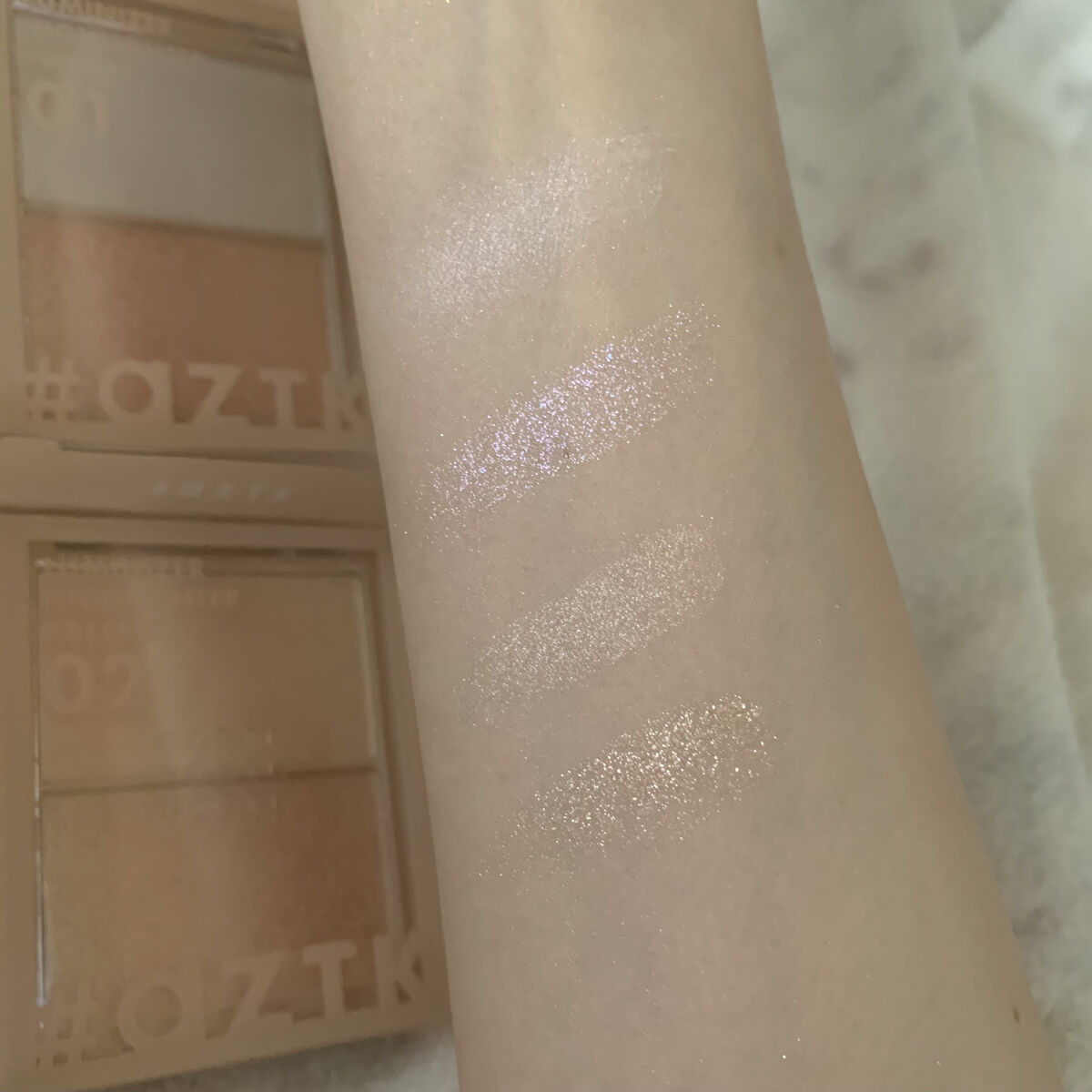 しっとりとした粉質に感動! しっとりとしていて、粉飛びしにくく感じました! 2種類のハイライトが入っていて便利! キラッキラのラメのタイプと、細かいパールがぎっしりと詰まった艶タイプの2種類が1つのパレットに入っています! 500円でこのキラキラ感と艶感はすごいなと思いました! コスパよく、しっかり輝くものを探している方におすすめです!