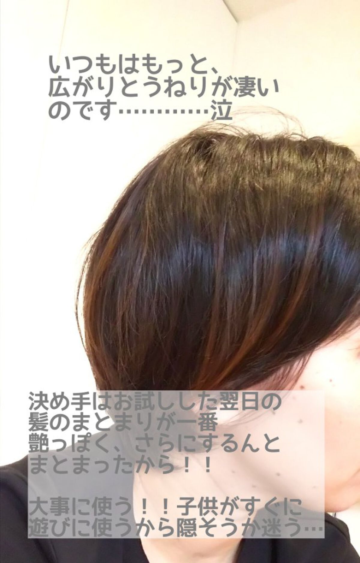 ヘアミストなので、持続時間が短いのと、髪が束ねやすくなるし、別にぺったりしたり、髪が水っぽくなったりせず、くせ毛、猫っけ、細毛、多毛でもありがたく使用できてます💞